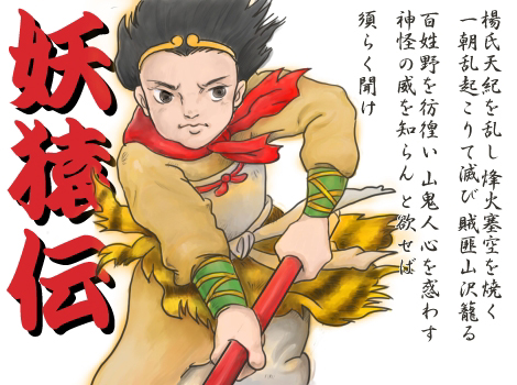 [作者] 諸星大二郎 ▲似顔絵(模写です!)は孫悟空----------今回は漫画について書いています。その作品の名は『西遊妖猿伝』、西遊記を元ネタにした作品です。内容は「西遊記」をベースに、隋末から唐初の混乱の時代を舞台とし、悟空達を人間という設定にして、玄奘とともに天竺へ向かうという、史実をも絡めた物語になっています。実はこの作品、まず1983年に双葉社の「月刊スーパーアクション」にて連載を開始されたのですが、のちに潮出版社の「コミックトム」に変わり一旦中断。そして11年たって今度は講談社の「モーニング」にて連載が再開されるという、壮大かつなんとも気の長い作品なのでした。(物語の流れもゆっくりなため、沙悟浄が登場したのは、なんと講談社に移ってからなのです(笑))正直、諸星大二郎先生の絵は、かなり独特です。(もしかすると女性は敬遠するかも...)間違いなくワン&オンリーの、まさに諸星大二郎先生だけしか描けない絵だと思います。そして作品としては、やはり抜群に面白いです。もうストーリーの組み立ては、非常にうまい!!特に最初の頃のパワーはムチャクチャはすごく、実にグイ、グイ、グイー!と読ましてくれます。悟空は水簾洞で無支奇という妖怪と出会い、その強大なる力を受け継ぐ。けれど民衆の怨念によって増幅される無支奇の力は、悟空の行く先々で多くの血を流させる。自分の運命、宿命というものに悩みながら悟空は、紅孩児、竜児女、そして玄奘など多くの人物と出会いながら、自分の進むべき道を探していく。それらの物語をじっくり読ませながら、所々でパワフルなシーンをドドーンと入れてくるのです。初期の頃では水簾洞での無支奇の場面、竜児女の死の場面、そして天界ならぬ都の宮城の中での大暴れの場面など、しっかりと作られた物語の流れの中で見ごたえのある場面をうまく入れていて、実に盛り上げてくれています。また先にも書きましたが、悟空達を人間にしていて史実の人物も登場していますので(とにかく登場人物達が個性的!)、妖怪などが出ていてもあまりおとぎ話的な感覚は無く、リアルな感じさえもします。物語が進むにつれ、悟空は成長してきていて悩むこともなくなり、自分自身をコントロールできるようなってきています。また都を出て以来砂漠の風景が多く、単調な感じがして、作品そのものの魅力が少々減っている気はします。とは言え見せるところは見せてくれます!西域篇第1巻での、悟空の途方もない力により恐竜の化石が起き上がる場面や、石槃陀(沙悟浄のことです)が流砂に消えてしまった母親のミイラを抱きしめる場面など、やはりインパクトのある場面を放り込んでいて(そこにもって行くまでの進め方などがまたイイんです)、じっくり読ませてくれる作品であります。*****実は今回の似顔絵、以前より気になっていたペンタブを購入し、パソコンで描いてみました。栄えある作品第一号は最初から悟空にしようと決めており、悪戦苦闘しながら、なんとか描きました。本当のトコロ、悟空の顔は全然似てませんが、これはまだペンタブになれてないとかの問題ではなく、ただ単に自分のヘタさが原因のような気がします(笑)それにしてもペンタブを使用しのパソコン絵は楽しいのですが、カラーの分だけ異様に時間がかかっていました。西遊妖猿伝西域篇(1)価格:760円(税込、送料別)西遊妖猿伝西域篇(2)価格:760円(税込、送料別)
