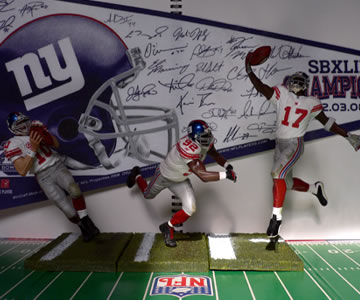 とうとうNY.ジャイアンツの今シーズンが終わってしまいました。ジャイアンツのレギュラー・シーズンの成績はというと、12勝4敗、NFC東地区優勝、そしてNFC第1シード獲得、という立派なものでした。昨年に引き続き優勝するのではという声もチラホラ。そしてスーパー・ボウルに向けてのプレーオフ。第1シードのジャイアンツは、2回戦から登場。しかしそこで宿敵イーグルスに負けてしまい、あっさり連覇の夢は消えてしまったのでした。 ▲QB.#10:イーライ・マニングそれにしても人間は本当に現金なものですネ~。昨シーズン17年ぶりに優勝した後、また17年後ぐらいに優勝すればイイなぁ~と思っていたのですが、いざ好成績だと今年も優勝!とおもわず期待してしまいました。(メディアでも本命候補に上げられたりしたのでよけいに)それがいざ負けてしまうと、妙にこたえてしまいました。今までもプレーオフで負けたことは何度もあったのですが、今回は変に期待してしまった分、なんか落胆の度合いが大きかったですネ~。 ▲DE.#92:マイケル・ストレイハン今回、写真に撮ったのは、マクファーレンのNY.ジャイアンツの人形セットです。もしかして今年も優勝するかもしれないとの期待で、記念グッズを買う為にとっておいた冬のボーナスのお小遣い。その夢が破れてしまい、このセットを購入したのでした。QB#10:マニング、WR#17:バレス、DE#92:ストレイハンの3体セットです。それにしてもさすがマクファーレン、細かくできていますネ~。約17cmほどですが本当に精密で、そのディテールの素晴らしさにホレボレしちゃいますヨ。(汚しや質感もなかなかグー!)さっそく「NY.ジャイアンツの殿堂」(グッズを置いてある本棚の事です)に飾っちゃいました。暇があるとジ~っと眺めては、あっさり終わってしまった今シーズンの悲しさを慰めています(笑) ▲WR.#17:プラキシコ・バレス※実はバレスの人形を飾ってる時、誤って落としてしまいボールが外れちゃいました。 思わず半ベソをかきながら、瞬間接着剤でくっつけたのでした。+++++++++NFL マクファーレン 3体セットイーライ・マニング/プラキシコ・バレス/マイケル・ストレイハン...