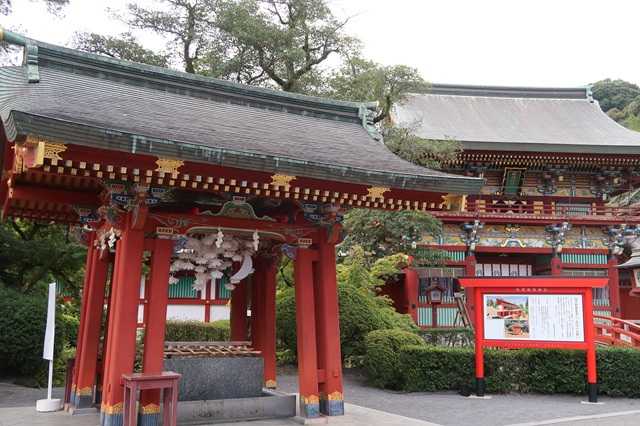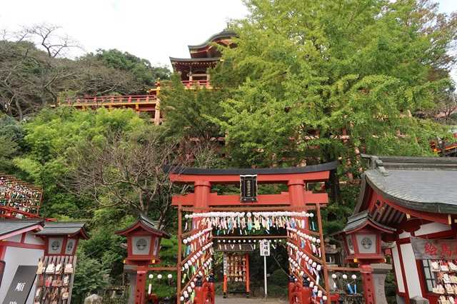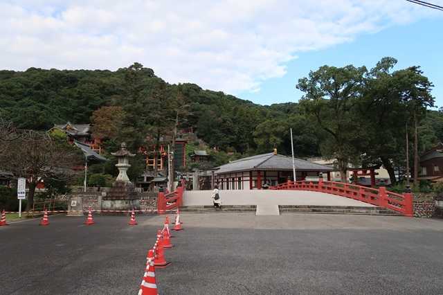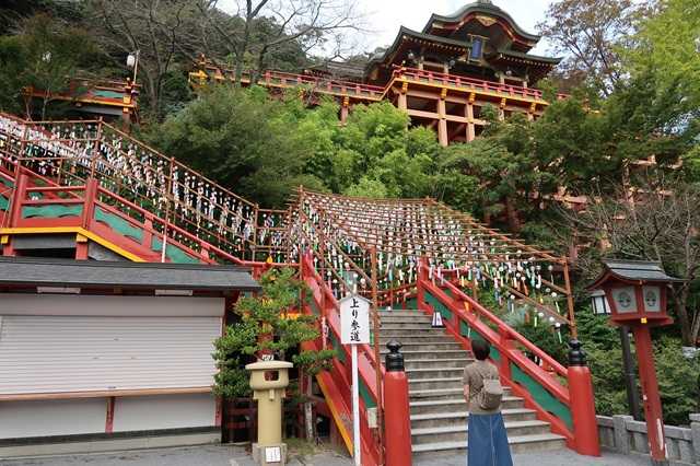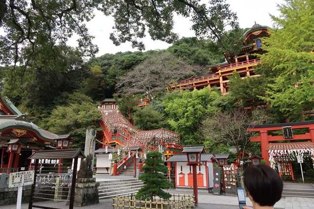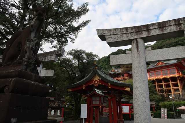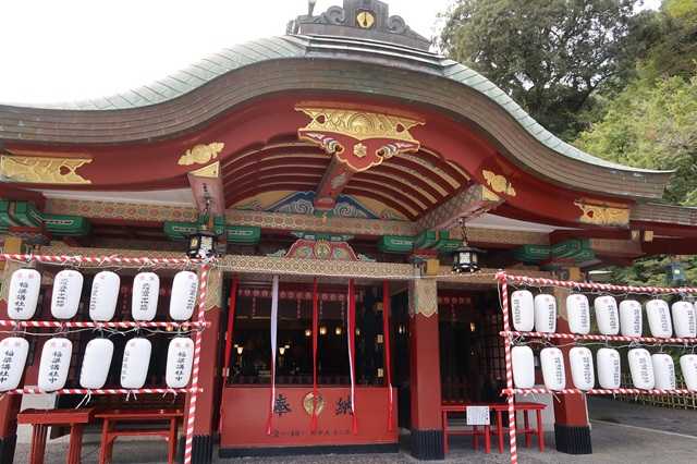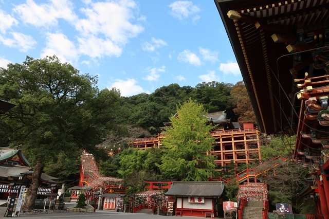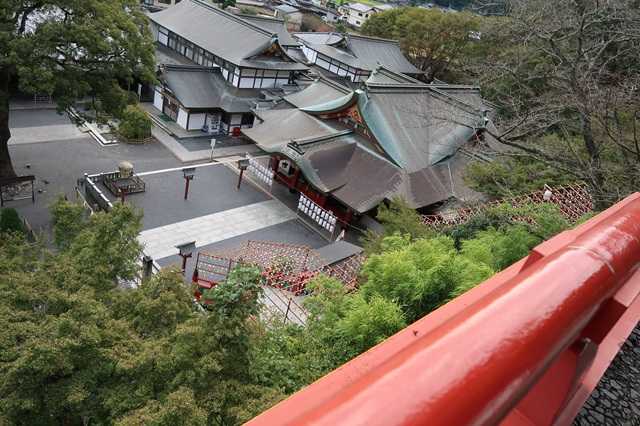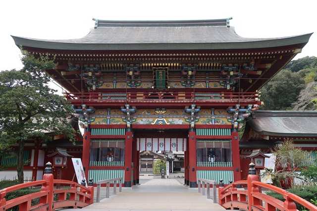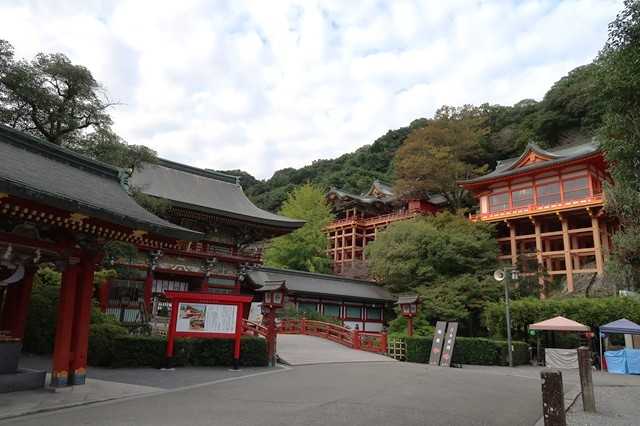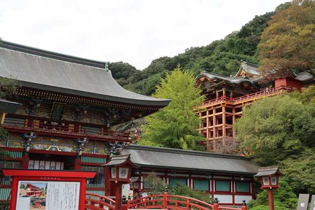 豪華絢爛な社殿:総漆塗り極彩色の社殿は「鎮西日光」とも称され、圧倒されるほどの美しさです。崖に建つ舞台造りの本殿は高さ約18メートルを誇ります。