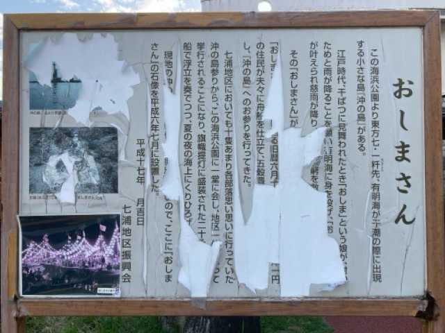 ・・・その昔、有明海沿岸地方が干ばつに見舞われたときに雨乞いを祈願し、人身御供として「おしま」という娘が身を投じ、その後間もなく沖の島に屍となって流れ着き、願いは叶えられ、雨が降り豊作となったことで、おしまをこの島に奉り、雨乞い祈願の神様として信仰したことから、沖の島を「おしまさん」と呼ぶようになったといわれている。