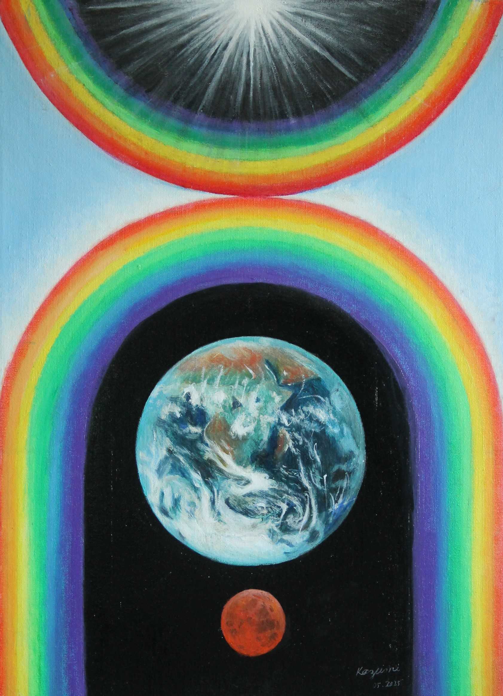 虹と地球oil on canvas 16"x22"05/2025古い最新作品。全く変なタイトル。と言うのは、この作品、最近何処か奥から出て来た。作品のことはよく覚えているが、制作年月日はどこにもない。でもこれは、地球を描いた最初の作品だ。その後、これをベースにした作品を沢山描いているが・・・。このオリジナル作品は、すかっり忘れられて、傷つき、色褪せ、汚れてどこかからひょっこり出て来た。サインも入っていないし、勿論未完成だ。この記念すべき未完の作品、多分1990年代の物だと思う。汚れたところ、傷ついたところ、色褪せたところは手を入れ、必要なものを加筆して、完成したのはつい最近。地球は、多分30数年前、初めて宇宙からの写真として発表されたもので、月は、最近の皆既月食を取り入れた。始めたのが1995年としても完成が、2025年、30年の年月を経ての完成だ。やっぱり、古い最新作品と言う事になる。