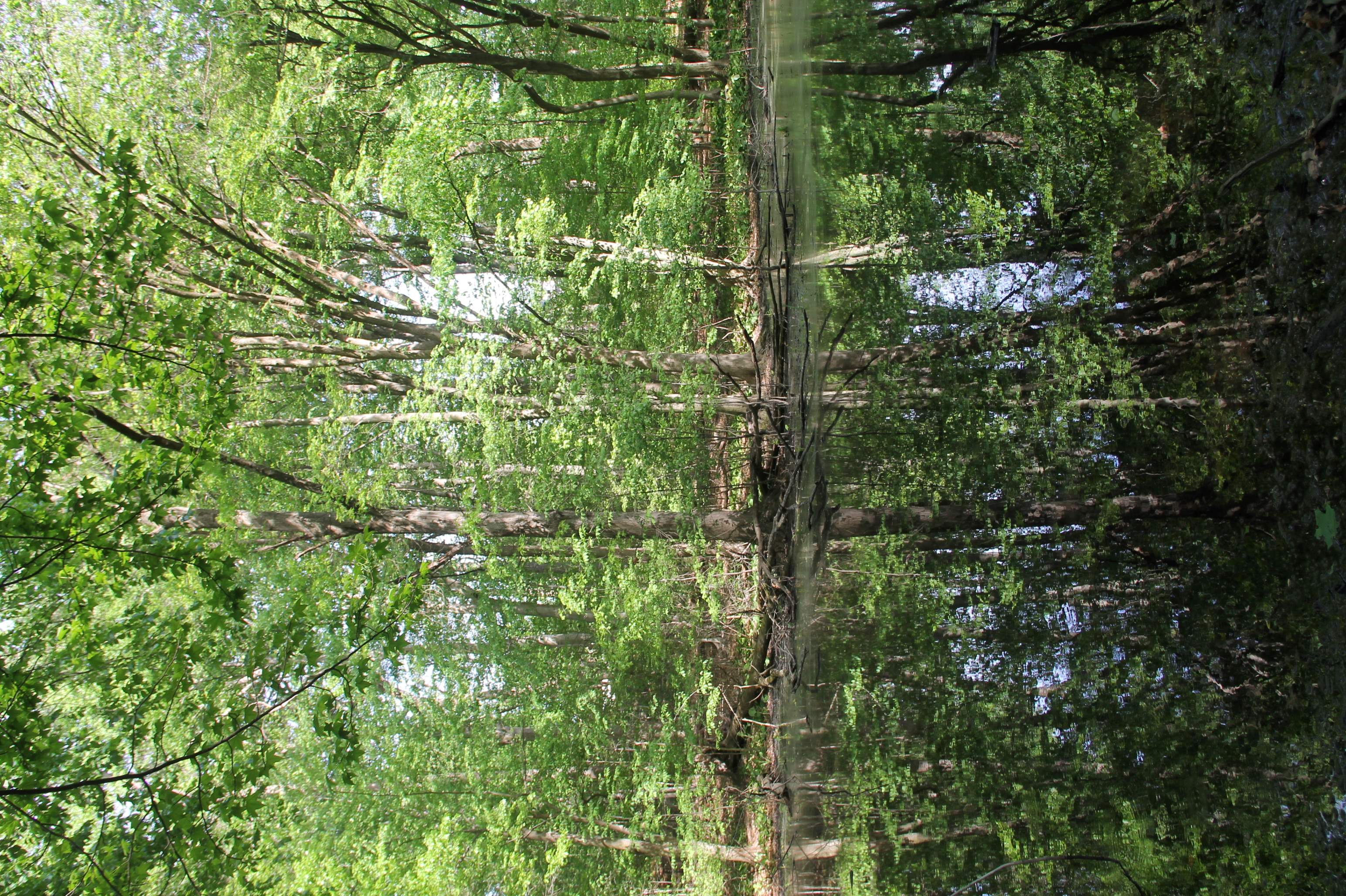 池の周りも回りたいと言う欲望を抑えて・・・板橋からほんの数歩歩いて、池の淵に立った。凪いだ水面に写る森の緑。深く、魂に届く緑。吸い込まれそうになる静寂と命の騒めき。小さな波紋でも揺らぐ水面と森の木々。湿気を吸った柔らかい地面にはこれも鮮やかな苔。このまま、池の淵を歩いて・・・。いやいや!!途中でバテて帰れなくなったら大変。理性が勝って・・・後ろを向いて、板橋を渡った。左上奥、左に大きく曲がった木の所が、メインストリート、飛び石の所だ。ここを右に行くと、森の中を突っ切って、池の反対側にも行ける。目の前の違う種類の双子の様な木は、きっと実生の時から二人くっついて成長したのだろう。種が落ち芽を出し・・・倒れた木は朽ちていく・・・。この当たり前の自然の摂理から分離している人間。目に見える物だけ、数えられるものだけ、数えられない物でも数値に直して安心する。喜ぶ魂と一緒に、ふわふわ、フカフカの落ち葉踏みしめてガサガサとを歩く。風の囁き、木洩れ日の揺らめき、何種類もの小鳥の鳴き声。さっき、奥に見えた曲がった木の所がメインストリートだ。自然を壊さない様に、でも、危険の無い様に、森はカウンティーによって、しっかり管理されている。少し西に傾きかけた日が作る影が優しい。切った木の中は空洞。動物さん達のねぐら。森は自然に満ちている。不思議に包まれている。もうすぐ森の出口だ。今来た方を振り向いて森の緑を吸い込む。左上にはもう民家も見える。この木が倒れた時のことも知っている。十数年の年月があの瑞々し有った大木を腐食させ、土に戻す。がさっという音に目をやると、リス君。ああ、初めて知った。リスは森と保護色だった。カズ姫の立てるガサガサに驚いたのか、数羽の鳥が一斉に飛び立つ。野生の鳥は素早い。かろうじて一羽をキャッチ。木の葉が茂った夏の森では、声はすれども中々姿は見えない。多分この鳥だ。ラスティ―ブラックバード。絶滅危惧種で、この森に生息していると言う。森の北側の出口に出た。命は、生まれて、成長し、死に、朽ちていく。大いなる自然を魂に感じた、素敵な母の日の森の散歩。爽やかな5月の森。もう少しすると蚊の天国。つづく
