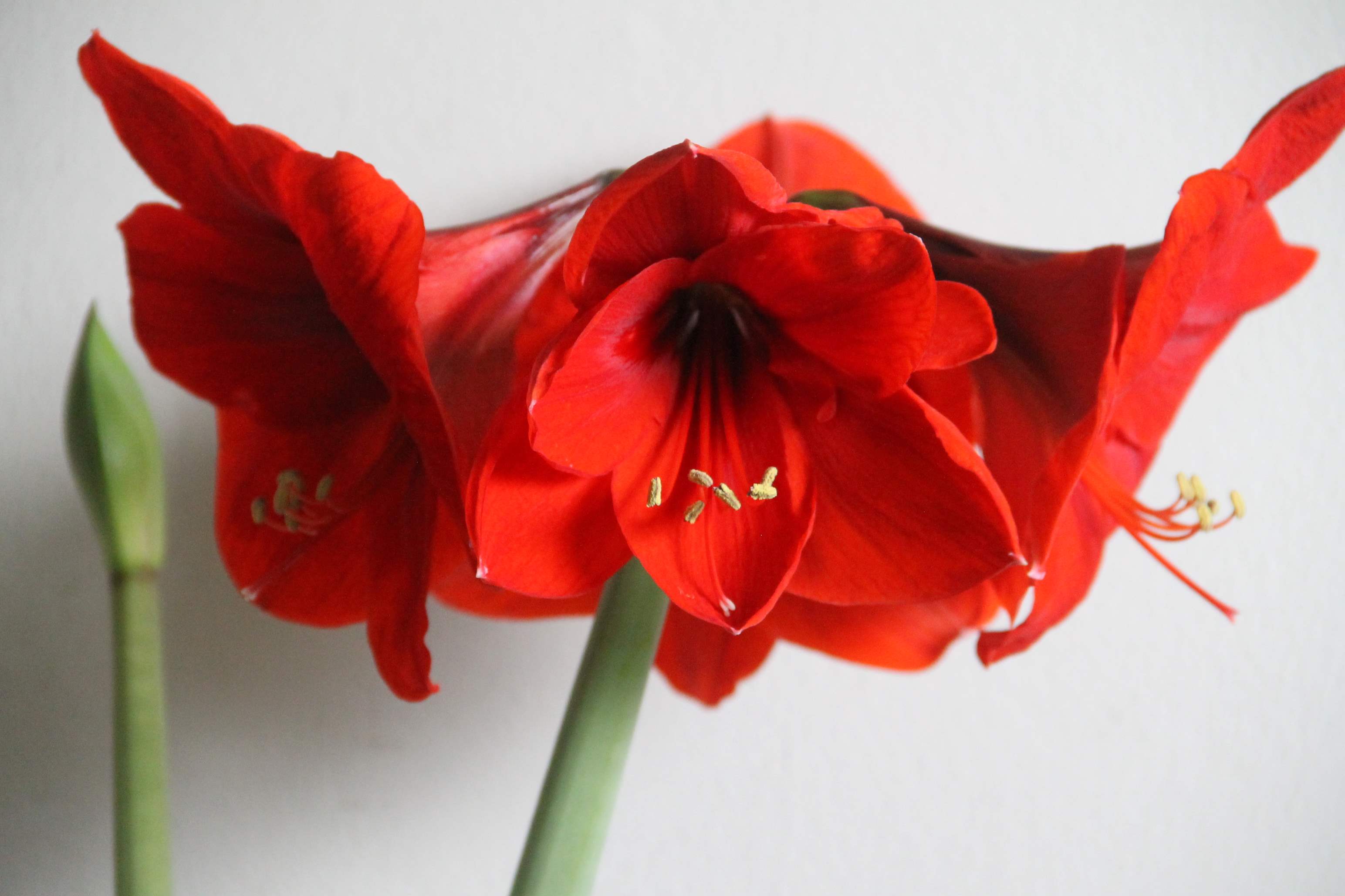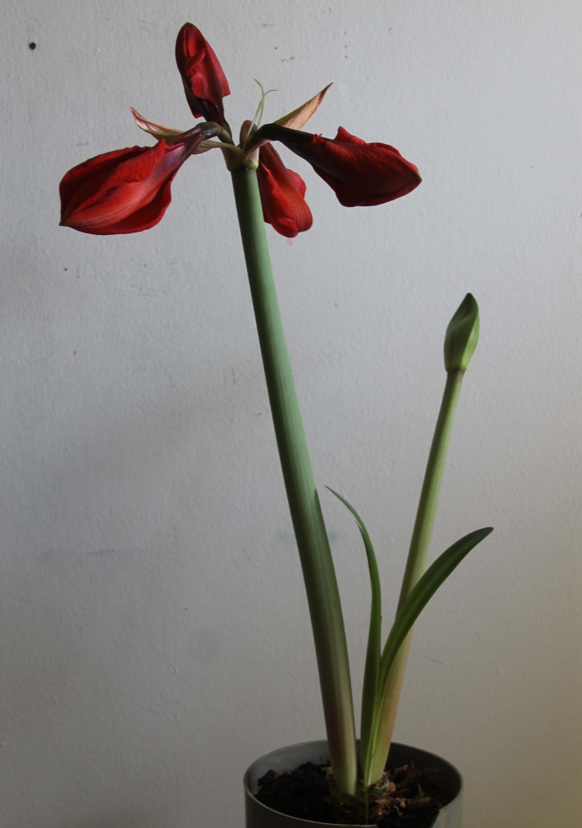 今日は4月6日。早いものだ!!参考の為、これは4日の最後の写真だ。真ん中の最後に咲いた花はまだ開き切らず、雌しべも伸びきっていない。これは、昨日5日の写真。左の花が、最後に咲いた花。みんな同じ大きさで色なのに、なぜわかるかと言うと、6本の黄色い雄しべに、一本の長い雌しべに注目。遅く咲いた花の雌しべはまだ花びらにくっつくような感じで、上を向いていないので、この写真では見えない。真ん中と右の花は、もう雌しべがかなり上を向いている。4月5日。雌しべは大分上を向き、はっきりと3つに分かれた先が見える。第二蕾の先はまだ開いていいない。4月5日。この写真では、雌しべを比べると、右の花が、昨日咲いた花だと良く分かる。4月5日。部屋の植物をベランダに出したので、窓辺はスッキリしたので、アマリリス第一蕾が開きき切ったところで、窓辺に戻した。4月5日。暗くなってきたんで、フラッシュを点けた。窓辺では、ネギやパセリが冬中でも育っていた。そして、今日、4月6日。左の最後に咲いた花の雌しべも大分上を向いてい来た。4月6日。この時期に、絵筆で、雄蕊の花粉を雌しべに付けると種が出来る。4月6日。第一蕾が満開になったところで、第二蕾の先が開いた。雄蕊の花粉を雌しべに付けたくなるが、種を採ってももう蒔く事は無いので、受粉はしない。この辺では、4月は雨期だ。毎日曇りか雨の暗い日が続いているが、アマリリスの赤のお蔭で、気分が明るくなる。気温もマイナスにはならないが、かなり寒い。混乱した世の中だが、アマリリスのポジティブエネルギーをもらって、明るく希望を持って生きよう。物事を確り観察すると、その本質が見えてきて興味深い。第二蕾が花開く頃、またお知らせする。今日も良い日を!!