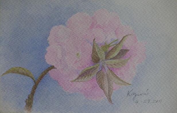 Cherry BlossomWatercplor on paper5 1/2"x 8 1/2"4/27/2011今年の春はのんびりゆっくりやって来て、突然すぎて行った。固い蕾と思っていた八重桜が、次の日には咲き始めて・・・。あっという間に満開になって、猛花吹雪。今はもう、夏の緑の木だ。一枚の写真も撮ってなかった。ついこの間描いたばかりと思っていた、八重桜の水彩画。もう15年くらいの前のものだった。時は過ぎ命は廻る宇宙の循環