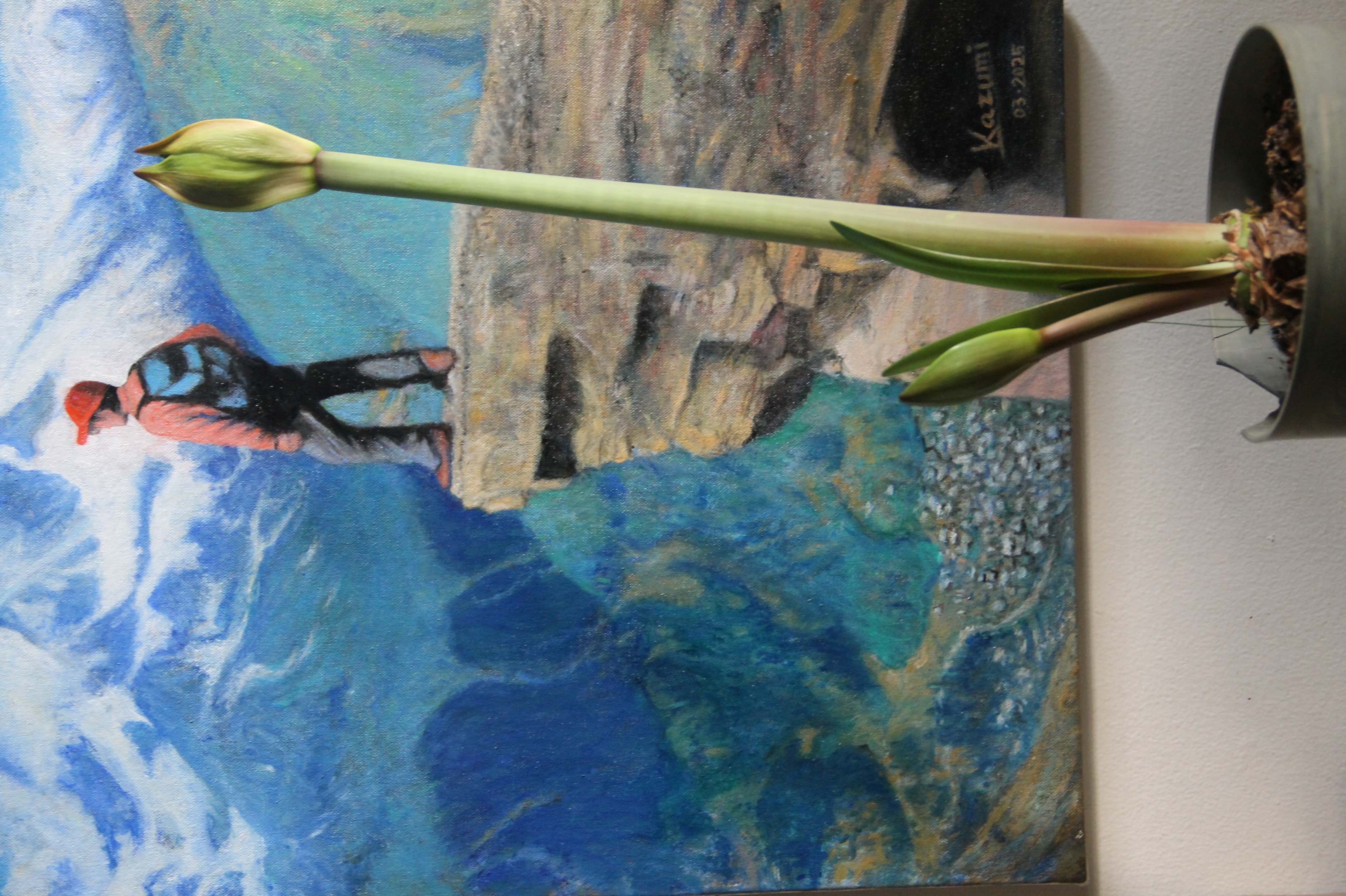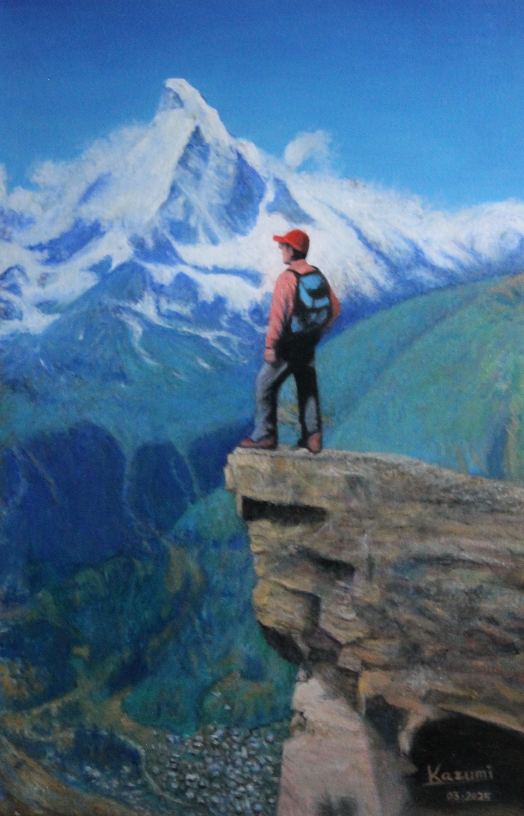 Hiro's view of Matterhorn and Chamonixoil on canvas29"x19"03/2025(Private collection)プロでも一年に何人かしか登れない言うマッターホルン。この絵の様な垂直な岸壁を、ロッククライミングで登って来た叔父と弟。この絵の風景の写真を撮ったのも、絵のモデルも叔父。叔父は、登山家、ロッククライマーでもあるが、写真も大好き、沢山の山の良い写真を撮って、展覧会など何回もしている。好きなことに没頭する楽しさ!!🌈