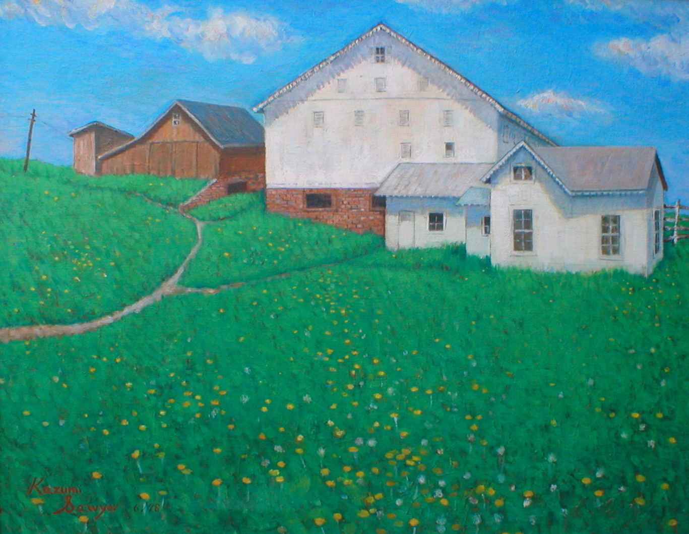 Dndelion Hilloil on canvas22"x28"06/1978ペンシルバニア州のランカスターと言う、アミッシュの住むダッチカントリーをドライブしていた時のことだ。タンポポが咲き乱れた丘に歓声を上げ、道路わきに駐車してキャンバスを出した。その町は、未だにオランダから入植してきた当時のままの生活を送っている。馬車が行きかい、人々は当時のままの家、宗教、服装で生活している。絵に描いたからか、この丘が目の前に広がっている様な感覚がする。かれこれ50年前のことだとは信じられない。