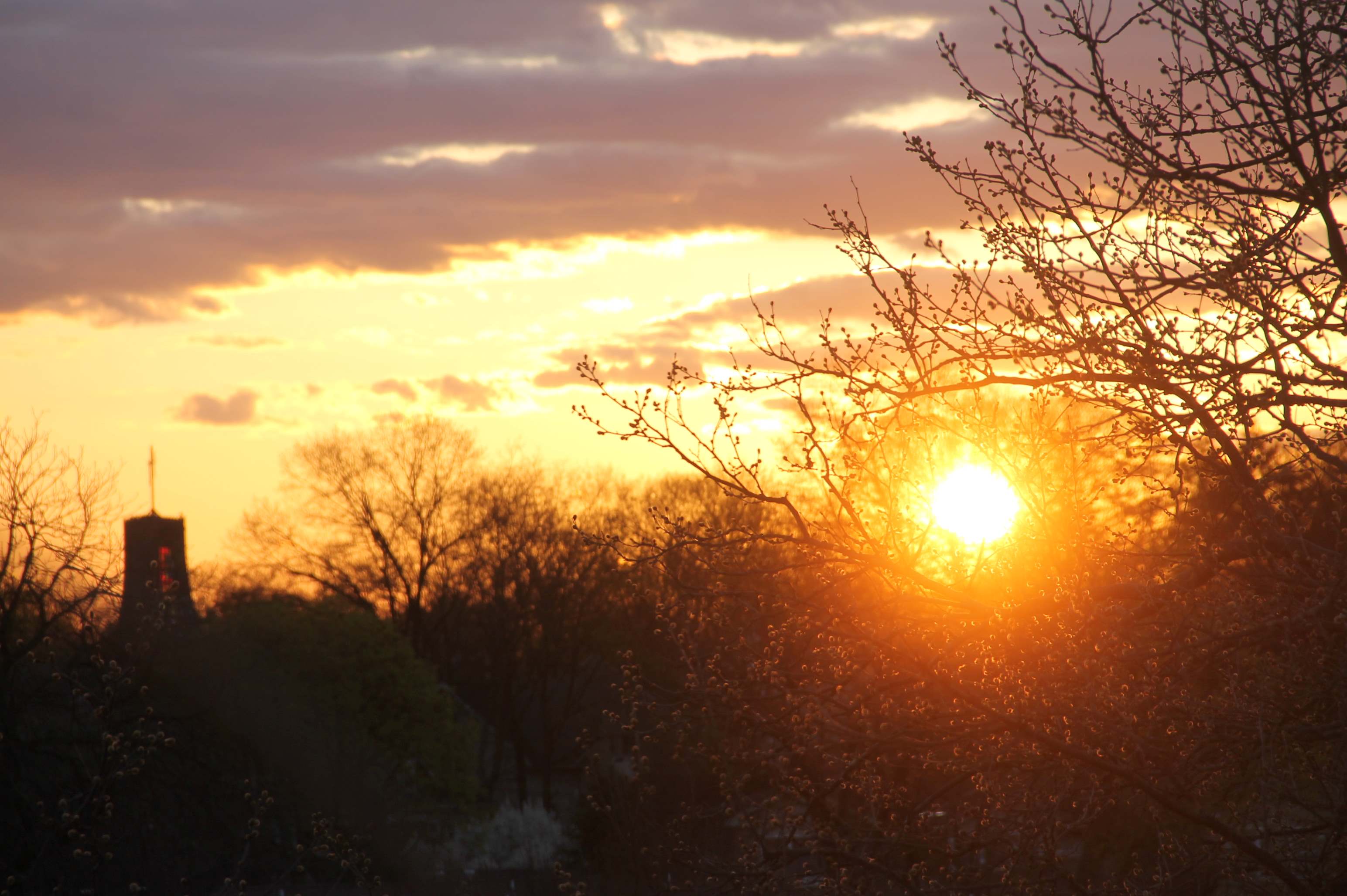 曇りや雨天が多く肌寒い春から、突然、春風の吹く本物の春になった。ベランダからの眺めも、色々なシェイドの黄緑が煙るように命を謳歌している。芽吹きの緑は命の緑。美し過ぎて飽くことを知らない。教会の塔も、すぐに緑に埋もれてしまいそう。手前のプラタナスももうすぐ実をつけつ。鈴掛の鈴がブラブラそんな光景もが目に浮かぶ。枝垂れやソメイヨシノはすっかり散ってしまったが、今は八重桜満開。芝桜やチュウリップも見える。この緑を渡って来る春風を受けながら、寝椅子にマットを敷いた揺りかごで、午後十読書。今年初めてのベランダ読書。ただ、ただ今の中にたゆたう至福の時。幸せって、今に没頭すると言う事かもしれない。夕方室内に入り、夕食の支度をしていると、べランダの方が真っ赤。え、何?!綺麗な夕焼けが空を覆っていた。夕暮れになっても風は春風。命の香りに満ちている。燃える夕焼け。燃える命。地上の闇と空の艶やかな夕焼けの対比がっ心に染みる。日没は今辺だった様だ。夜の帳が下りるまでの華やかな宴。このベランダからの眺めは、毎日見ていても毎日違う。ついつい写真を沢山撮ってしまう。季節だって同じように見えるが、毎年違う。景色もそれを見る自分も。命溢れる美しいこの地球。無限にある星の中でたった一つの私たちのホーム。住まわせてもらっていることに感謝。まるで、自分の物とばかりに横柄な扱いをする人類・・・。人間はただ自然の一部。自然の中で自然に守られて生きることしかできない。万物の霊長などと恥ずかしげもなく良くい言ったものだ!!!自然を破壊することは自分を破壊する事。今日も一日有難う。