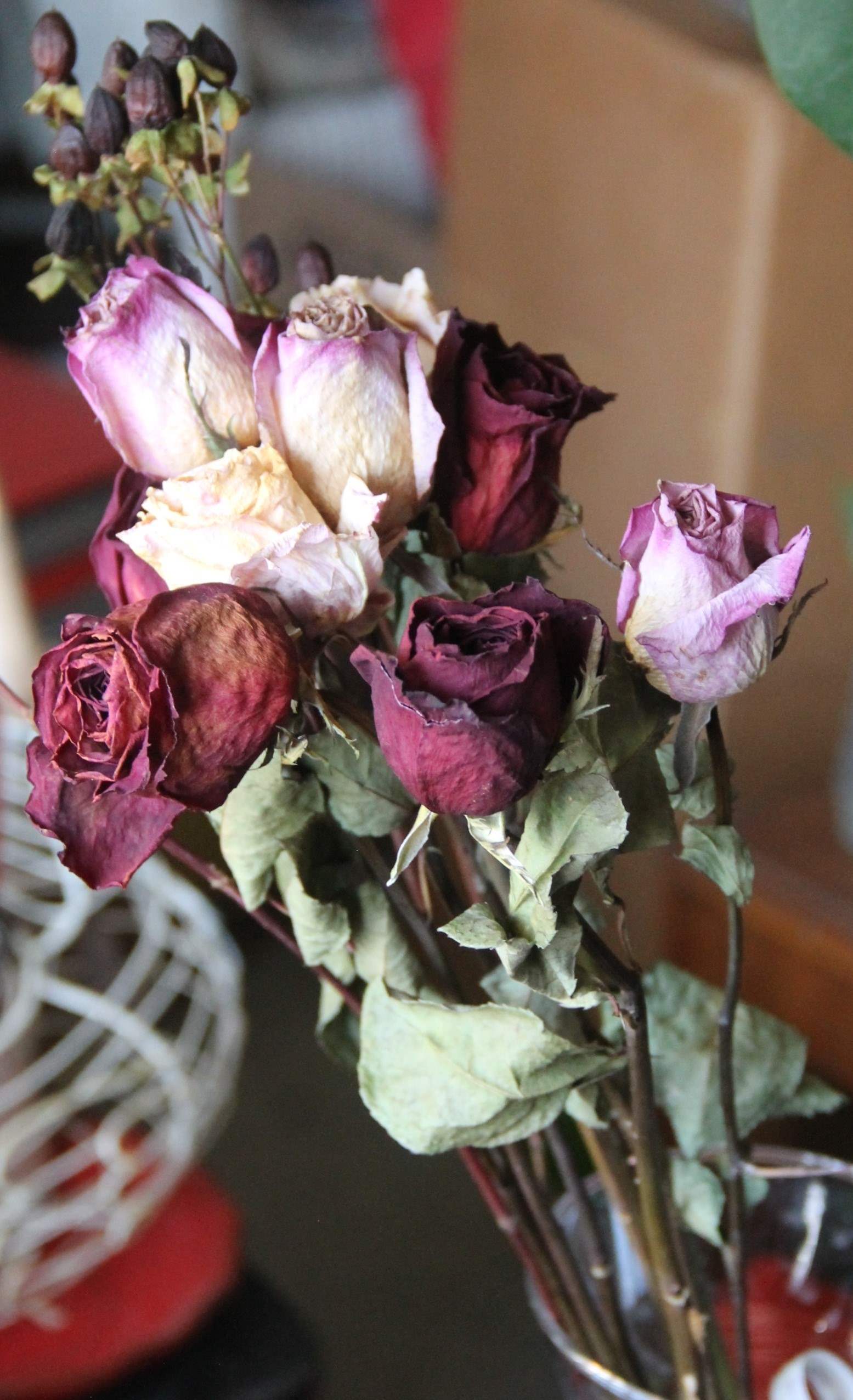 Eternal LifeOil on canvas20"x28"05/2008日本舞踊を趣味でやっていた母が80歳くらいの写真とバックは咲き切った月下美人を組み合わせたものだ。命は順繰りに受け継がれ不滅の命として、それぞれの瞬間に存続する。🌺🌼🌷🥀もう何回かご紹介した、バレンタインズデーの花束だが・・・。後で知った事だが、このバラは、フォ-エバー・ローズと言って、注意書き通りにケアすると、何と、最低、一年は保証付き。ケアが良ければ、3年はこのままだと言う代物だった。カズ姫は、注意書きを読まないで水を入れてしまったから・・・。さて、どうなるか…と言う所だが・・・。あれから、二週間、まだ生き生きしている。流石は、永遠のバラ。そう言う花があるとは知らなかった。一緒の日に届いた普通の花束は、バラ以外は、2週間も経って、こんな感じになってしまったが・・・。バラは、何時ものように永遠のバラにしようと、こんな風にさかさまにつるしてある状態だ。ドライフラワーになると、また味わいが違ってくる。それのぞれの瞬間に美しさが違う。だから、花でも追っかけは止められない。ここ何日かは、日差しは春。でも、散歩をしていると、風は冷たく感じる時もある。もう、逃げる二月も今日で終わりだ。明日から3月。弥生と言ったら春。たとえ、時々寒くても( ^ω^)・・・。