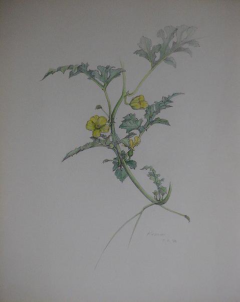 Water Melon flowercolor pencil on paper11"x14"07/1986これも思い出深い作品だ。ティーネックの一軒家に住んでいた時、裏庭に家庭菜園を作った。色々な作物を試み、その年は、スイカの種も蒔いてみた。切込みの入った綺麗な葉に、可愛い黄色い花にすっかり魅せられてしまった。色鉛筆を持ち出してスケッチした。蔓の伸び方、巻き方等細かい所にも注意を払って、楽しいひと時を過ごしたのを、昨日のことのように思い出す。で、西瓜は実ったかって?気候的にこの辺は合わないようで、大きな西瓜にはならなかったが・・・。児玉西瓜位の小さな西瓜が実って、深く感動したことは確かだ。昨日、石破総理と自己中トラの会見のライブを見た。世界から袋叩きに合っているトラ。金の兜迄もらって、大きな置き土産を携えて来た、忠犬ぽち。理論の石破か、行動のトラか等と言われていたから、日本の為に何か断固とをした事でも打ち出してくれるのかと、幾何かの期待もあったが・・・細い尻尾を大きく振って、結局今まで通りの忠犬ポチをやっただけだった。日本製鉄のUSSの買収に期待していたが、買収ではなく、投資だという全く日本にとっては、解決にもならない愚策でお茶を濁した臆病者だった。買収ではなく、投資ならいくらでも歓迎と!!トラは、思いかなって満面の笑み。日米軍事同盟に関しても、更なる確約と言うが、アメリカが日本の為に一肌脱ぐ筈などなく・・・。ただ、よく落ちる洗剤でも買わされるのならいいが・・・。良く落ちるオスプレーなどを高く買わされる羽目にならなければいいが。トラの機嫌を損ねずに、一山超えたという馬鹿らしい感想が、日本では呟かれている様で、トラにも吃驚仰天だが、日本国民にも政府にも吃驚仰天。日本の教育レベルはがた落ちで、先進国中ではエンゲルケー数が最も高い、つまり、貧しい国に成り果てたというのに、さらに投資とは。戦後80年経っても、国内に外国の治外法権地域を持つ、占領国の日本、それをニコニコ見ている、国民も国民だが。狂人トラを選ぶアメリア国民も、意識の低さはどっこいだけど!!世界は集合意識で成り立っているというから、少しでもプラス意識を放出して、🌍集合意識の向上に貢献している。微力でも無力ではないことを深く意識して。🌈♬🎨