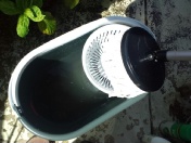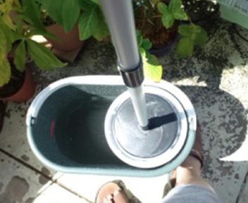 白いカゴの中にモップを入れて、ステップを踏めば水が絞れる・・