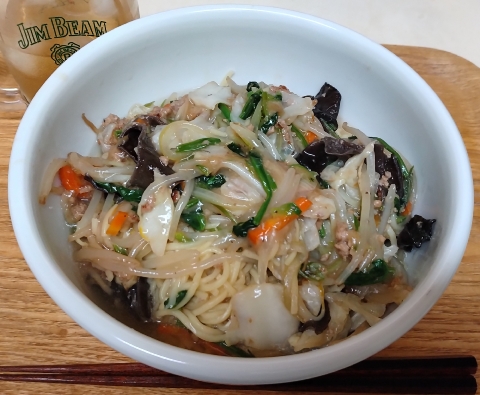 かつて美味しいうどんを自宅で食べることはできませんでした。無論、自らちゃんとした粉と水を用意して自身でうどんを打つだけの強いモチベーションがあれば自分ちでもかなり美味しいうどんが食べられていたはずです。しかし、そんな面倒を買って出るまでの根性の持ち合わせはないのです。今では冷凍うどんがかなり本格的な味わいが楽しめるようになったから当面はこれ以上の質は求めようと思わないのです。そもそもぼくはそこまでうどんに対して執着していないのです。と書くと誤解を招きそうですが一応お断りしておくと、コシが強くて何杯だって食べられちゃう讃岐うどんは食い倒れツアーを何度か敢行しているし、ゴリゴリの食感が癖になる武蔵野うどんや逆にコシも何もない伊勢うどん、名古屋の味噌煮込みうどんに甲府のほうとう等々、並べてみると自分がいかにうどんが好きだったんだなあと思い知るのであります。でもそうは言っても日常生活でうどんに気持ちが傾くことは稀でありまして、うどんを食べるならそばを食べようってなっちゃうのです。うどんは冷凍がいいのにそばは冷凍がイマイチ、それとは逆に乾麺はそばがかなり品質が向上したのに対してうどんでこれぞっていうのには未だ遭遇できていないのです。そんなだからつい乾麺のうどんで未食のものがあるとつい手に取ってしまい、ますます美味しいことが保証されている冷凍うどんを求める機会が少なくなるのでした。といった訳で、前回の焼きうどんトーストのうどんも乾麺を使ったものであり通常のたぬきうどんがイマイチだったので強引にアレンジしてしまった慣れの果てだったのです。ということで今回はうどん特集であります。 と言いつつまず登場するのはうどんならざるソフト麺なのです。良く給食の人気メニューとして紹介されますが、実はぼくはこのソフト麺を食べたことがなかったのです。小学校の6年間と中学校の2年間(3年目は給食がありませんでした)、何度か転校をしたものの一度たりともソフト麺を食べる機会がなかったのです。たまたまローソンストア100に立ち寄ったところなんと扱いがあるんですね。つい出来心で買い求めてしまいました。さてどうやって食べようか。ネットで調べるとミートソースをかけて食べるもしくはカレーソースで食べるのがメジャーかつポピュラーみたいなので前者にて食べてみることにしました。ふくい学校給食のレシピがアップされていたのでそちらを参考に作ってみることにしました。ソフト麺トマトソース【材料】ソフト麺 3袋/合びき肉 140g/にんにく・生姜 1.2g/トマト 200g/ニンジン(みじん切り) 80g/ 玉ねぎ(みじん切り) 160g/セロリ(みじん切り) 8g/ひらたけ 40g/ほうれん草(下茹で/2cm幅) 40g/鯖のへしこ 3g/トマトケチャップ 大さじ2/ウスターソース 小さじ1/赤ワイン・白ワイン・オリーブ油 大さじ1/塩・胡椒 適宜【作り方】1. 鍋にオリーブ油を熱してにんにく、生姜を炒める。鯖のへしこを加える。合びき肉を加える。ニンジン、玉ねぎ、セロリ、ひらたけを加える。塩、胡椒する。赤ワイン、白ワインをえる。トマトを加えて煮る。トマトケチャップ、ウスターソースを加える。温めた麺の上にかけ盛り付ける。 赤白ワインを使うなんてちょっとユニークなレシピに思えましたが、思った以上に古系のミートソースの味わいでした。ソフト麺はねえ、そんなには美味しいと思えないんだけどねえ。当初はカレーソースも試してみることを想定していましたがわざわざリピートはしないのだろうなあ。 愛知県岡崎市にはもろこしうどんという変わりうどんがあるようです。うどんととうもろこしの組合せは間違いないでしょう。【材料】冷凍うどん(茹でる) 1玉/コーン 大さじ5/卵 1個/三つ葉・ねぎ(みじん切り) 適宜/【だし】めんつゆ・醤油・みりん・酒・塩・水 適宜/片栗粉 大さじ1/水 大さじ2【作り方】1. 鍋で【だし】の材料を沸かす。水溶き片栗粉を加える。コーンを加える。溶き卵を加える。2. 器にうどんを盛って1.を注ぐ。三つ葉、ねぎを散らす。 うん、想像通りで美味しいです。でも味が単調なので段々と飽きてくるのです。甘みも飽きに拍車をかけるようです。少な目ならいいのですが、少量で作るのは面倒です。ということで次の登場はあるのかなあ。 カニカマで作るインチキかに玉風がチープに思えますが、あんかけが寒い日にはありがたい。ってことでかに玉うどんです。【材料】袖る(茹でる) 1玉/カニカマ(割く) 4本/卵 1個/長ねぎ(小口切り) 5㎝/めんつゆ 50ml/みりん・酒 大さじ1/オイスターソース 適宜/水 300ml/片栗粉 大さじ1/水 大さじ1【作り方】1. 鍋で水を沸かしてカニカマ、めんつゆ、みりん、酒、オイスターソースを加える。水溶き片栗粉を加える。溶き卵を注ぐ。丼にうどんを盛ってかける。長ねぎを散らす。 うん、まあ美味しいですね。でも中華の卵料理全般に言えることですが、味がのっぺりと平坦な感じで途中味変できるような仕掛けが何かあ