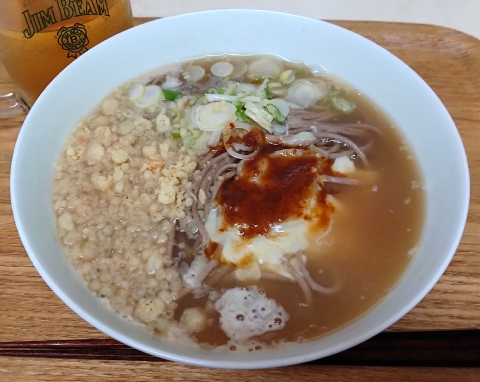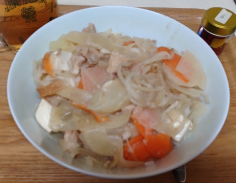新潟の妙高で食べられているというとん汁ラーメンを先般作ってみました。確かに悪くないんですよね。だってちょっと単調になると腐してみせながらも舌の根の乾かぬうちにちょっと具材を足して作っているんだからやはり結構気に入っていたと思うのです。秘密のケンミンショーで得た情報によるととん汁ラーメンの基本的なベースとなるのは醤油ラーメンではあるけれど、他にも塩ラーメンや味噌ラーメンもあるらしいからもはやどんなラーメンだって構わないようなのです。それは実は最初に食べた時にぼくも気付いていて、このとん汁はかなり広く応用が利くと察しが付いたのでした。というのが大量の玉ねぎを使って汁気が少なくなった「とん汁の店 たちばな」(https://tontachi.com/)のとん汁は汁とあるが、ほとんど味噌仕立ての肉豆腐みたいなものだから他の料理への展開がいくらだって出来そうに思えたのです。 ちなみに具材を追加したとん汁の材料は以下のとおり。大根、ニンジン、もやしが加わっているだけであります。大根、ニンジンは極めつけに凡庸でありますが、固く絞ったもやしが食感に良いアクセントをもたらしているように思うのですが、いかがでしょ。とん汁 具材増しver.【材料】玉ねぎ(くし型切り) 1.5個/豚肉(3cm幅) 100g/木綿豆腐 1/2丁/大根(銀杏切り) 3cm/ニンジン(銀杏切り) 3cm/もやし(茹でる/搾る) 1/2袋/白味噌 大さじ4/ラード 大さじ2/水 100ml だからってとん汁丼っていくら何でもいい加減すぎやしないかい。なんてご意見は聞き流すことにさせていただくのでありますが、まあめしに味噌汁をぶっかけたねこまんまの豪華ヴァージョンだから不味いはずがないのです。【材料】ごはん 1膳分/とん汁 1杯分【作り方】1. 丼にごはんを盛ってとん汁をのせる。 汁気が好きないので思った以上に丼っぽくなりました。でもとん汁ラーメンのようにある程度の普遍性を勝ち取るってなことにはなりそうもないですね。 続いてもなんの工夫もなくラーメンの代わりにかけそばにとん汁をのせてしまいました。とん汁そばなどと料理名を付けるのもおこがましい。【材料】そば(茹でる) 1玉/豚バラ肉(3cm幅) 80g/玉ねぎ(くし型切り) 1玉/木綿豆腐(6等分) 1/2丁/サラダ油 小さじ1/味噌・塩 適宜/めんつゆ・水・胡椒・七味唐辛子 適宜【作り方】1. 鍋にサラダ油を熱して味噌を炒める。豚肉を加える。玉ねぎ、塩を加える。木綿豆腐を加えて煮る。2. 丼にめんつゆ、湯を入れてそばを加える。1.をのせる。 でももしかするとこれってラーメンよりも美味しいかもよ、なんて思うのは身贔屓にすぎるかなあ。言うまでもなくうどんにだってあうのでしょうね。 やっぱりなどと言ってくださるなかれ。ってまあ、やっぱりやっちゃいました。とん汁カレーです。【材料】ごはん 1膳分/【カレー】玉ねぎ(くし型切り) 1/4個/ニンジン(銀杏切り) 3cm/青ねぎ(4cm幅) 1束/にんにく・生姜 小さじ1/ラード 小さじ2/カレー粉・カレーフレーク 大さじ1/水 200ml/【材料】1. 鍋でラード、白味噌を炒める。玉ねぎを加える。豚肉、大根、ニンジンを加える。木綿豆腐を加えて弱火で20分煮る。もやしを加える。2. 鍋にラードを熱してにんにく、生姜、玉ねぎ、ニンジンを炒める。青ねぎを加える。カレー粉を加える。水を加えて煮る。カレーフレークを加える。3. 皿にごはんを盛って2.、1.をかける。 あえて通常のカレーととん汁を別個に盛り付けました。だって合わせて煮込んだら単に豆腐入りのカレーでしかないし、味噌だってちょっと分量は多めですが、カレーの隠し味によく使われますからね。ってわけでやっぱりね。最初に別盛にして正解でした。カレー皿に注いだ時点でほぼ一体となってしまったのでした(と書いたけれど、実際に写真をアップするとそうでもないか)。辛味がマイルドになるので、途中一味唐辛子をふりかけましたが、当たり前のようですが、非常に合うのです。でもまあこのためにわざわざカレーを作るのもどうかと思うので、お手軽なとん汁丼で十分ではなかろうかと思った次第であります。 ところで、こうして改めて「たちばな」のHPを見てみると、どういうことだろうか、品書きのとん汁を見ると結構汁気があるじゃないか。もしかするとぼくは比較的オリジナルに忠実なものを作っていると思いながら、実のところは全く別の料理を作ってしまっていたのではないだろうか。と茫然自失に陥るかというとそんなことはなくって、これはまあこれで旨いからいいじゃんと開き直るのであります。