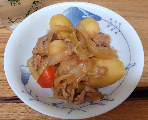 肉じゃがって子供にも大人も人気のメニューで好きな日本の食事ベストなんとかなんていう調査をしたら結構な上位にランキングされるんじゃないでしょうか。そういえば肉じゃがの起源としては、東郷平八郎が留学先のイギリスで食べたビーフシチューを料理人に作らせたという話が流布されているけれど、その真偽はかなり眉唾だとぼくは思っています。とWikipediaを見るとその噂の検証がなされているけれど、なかなかに愉快なので興味のある方はぜひご一読を。ちなみに、魚柄仁之助によると、肉じゃがが料理名として確認できる初出は、雑誌『主婦と生活』の1950年(昭和25年)1月号であり、四谷見附にあった外食券食堂のメニューに「肉ジャガ」があったと報告されている。しかし、それがどのような料理であったのか具体的にはわかっていない。,あた、魚柄仁之助によると、最も古くに「肉じゃが」の料理名でレシピが紹介されたのは、『きょうの料理』のテキストの1964年(昭和39年)5月号であり、料理本で「肉じゃが」の料理名が一般的に使われだしたのは1975年(昭和50年)頃からである。との記載もあり、案外その歴史は短いんだなあなんて思ったりもするけれど、肉の一般家庭への普及を考慮するとそんなものかとも思えてくるのです。カレーライスと同様に用いる肉は、一般に東日本では豚肉、西日本では牛肉といったイメージがあるけれど、鶏肉を使うレシピもあるようで、ぼくにとって馴染みのあるのは豚肉ですが、食べたいのは牛肉とまあその辺は好みで使い分ければいいのではないかと思っています。山椒を加えるレシピも紹介されているし、具材も多少の違いはあるから、馬齢者と肉が入った醤油、砂糖の甘じょっぱい煮物といった程度に定義して、好みに合わせて作って構わないんじゃないかなあ。肉じゃが【材料】豚肉(一口大)・じゃがいも(皮を剥く/一口大)・ニンジン(乱切り)・玉ねぎ(くし型切り)・ごま油 適宜/【調味料】酒・醤油 大さじ3/みりん・酒 大さじ1/顆粒だし 小さじ1/2【作り方】1. 鍋にごま油を熱して豚肉、ニンジン、玉ねぎを炒める。じゃがいもを加える。【調味料】を加えて煮る。 といった訳で今回はあり合わせの食材で作ったので、白滝も彩りの絹さやもなし。ぼくの最近流行りのレシピは、普通のとちょっと違うのが、玉ねぎを大量に使って日本酒をお玉一杯程度入れて水は加えないところ。水分多めのびしゃびしゃ系も嫌いじゃないのですが、調味料の節約のためにも水気は少なめにしています。肉じゃがカレー(ヒルナンデスCuisine)【材料】ごはん・肉じゃが 適宜/めんつゆ 15ml/水 100ml/カレールー 2片【作り方】1. 鍋に肉じゃが入れて加熱する。めんつゆ、水を加える。カレールーを加えてマッシャーで潰す。皿にごはんを盛ってかける。 惣菜のアレンジレシピって案外平凡になりがちです。テレビで紹介されたというこれと次の2品も非常に単純で試さずとも想像できるわいといった程度のものでしたが、一応は試してみないとね。ということでこのカレーはちょっと甘めで和の風味がほんのりとするごく普通に美味しい仕上がりでした。肉じゃがパスタ(ラヴィット)【材料】パスタ(茹でる) 150g/肉じゃが 150g/トマト水煮 1缶/胡椒・オリーブ油・にんにく 適宜/ローリエ 2枚【作り方】1. フライパンにオリーブ油を熱してにんにくを炒める。トマト水煮、ローリエを加える。肉じゃがを加える。パスタ、茹で汁を加える。皿に盛って胡椒を散らす。 これまた非常に凡庸なレシピ。トマト水煮とローリエを用いるのでありますが、どちらも分量が多めでせっかくの肉じゃがの存在を減じてしまっているように思えました。けして不味くはないのですが、これじゃじゃがいも、肉の入ったトマト風味のパスタに過ぎないように思えました。