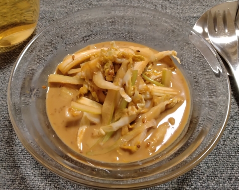 白菜料理は色々あるけれど、煎じ詰めるとぼくにとって最高の白菜料理はお新香ということになります。キムチも無論美味しいけれど、それ以上に単に塩と唐辛子で漬けただけの日本式のお新香が一番だと思っています。白菜のお新香に鰹節を散らして醤油をたらっと垂らしたのがあれば、それだけで酒の肴としては事足りるし、飯のアテにも十分です。太宰の短編の主人公も口ではぼくと同じようなことを言っています。太宰治著「新郎」 食卓には、つくだ煮と、白菜のおしんこと、烏賊の煮附と、それだけである。私はただ矢鱈に褒めるのだ。「おしんこ、おいしいねえ。ちょうど食べ頃だ。僕は小さい時から、白菜のおしんこが一ばん好きだった。白菜のおしんこさえあれば、他におかずは欲しくなかった。サクサクして、この歯ざわりが、こたえられねえや。」「お塩もこのごろお店に無いので、」家の者には、やっぱり自信が無い。浮かぬ顔をしている。「おしんこを作るのにも思いきり塩を使う事が出来なくなりました。もっと塩をきかせると、おいしくなるんでしょうけど。」「いや、これくらいが、ちょうどいい。塩からいのは、僕は、いやなんだ。」頑固に言い張るのだ。まずしいものを褒めるのは、いい気持だ。 この主人公の新郎は、新妻に気遣って本音を語っていないのでありますが、全くの嘘ってことでもなさそうです。ぼくにしても一番お新香が好きとか書いている割には結構あれこれと料理しているからかなり眉唾な発言をしていると思われてるんだろうなあ。確かに白菜は生でも煮ても茹でても蒸しても焼いても炒めても美味しいものですし、もしかしたら揚げても美味しそうですしねえ。乾隆白菜[中国]【材料】白菜(黄芯/1cm幅) 320g【タレ(混ぜる)】/芝麻醤 160g/黒酢 大さじ2/砂糖 大さじ3/はちみつ 大さじ1/醤油 小さじ2/老抽(中国醤油) 小さじ1/2/白ごま 適宜【作り方】1. 皿に白菜をもって【タレ】と和える。 地味な料理ですねえ。でも地味だけど美味しくなるのが白菜ですねえ。酸菜白肉鍋(スワァンツァイ パイロウグゥオ)[台湾]【材料】酸菜(白菜漬) 300g/豚肉(バラ/薄切り) 200g/きのこ数種 適宜/豆腐(冷凍/一口大) 1丁/干しエビ 大さじ2/干し椎茸(水で戻す/千切り) 3枚・水 500ml・にんにく 1片/生姜 大さじ2/鶏がらスープの素 小さじ2/昆布 5cm/【タレ】【ニラだれ】ニラ(みじん切り)・酢・醤油 大さじ5/豆板醤 小さじ1/【オイマヨだれ】オイスターソース・マヨネーズ 大さじ2/【その他】練りごま・にんにく・ラー油・マスタード・レモン汁。酢 適宜【作り方】1. 鍋に干し椎茸(戻し汁)、鶏がらスープの素、干し椎茸、昆布、にんにく、生姜、酸菜を入れて煮り。豚肉を広げる。きのこ、豆腐を加える。 近頃流行ってるっていうのでいそいそと作ってみることにしたのです。ところが、期待していた程ではなかったかな。案外すぐに飽きが来ました。タレをあれこれと調合して食べるのがポイントですが、それってもとが飽きやすい料理ってことの証左のように思えます。麻婆春雨白菜[中国]【材料】白菜(1cm幅) 1/4株/春雨(茹でる) 20g/水(サラダ油、塩を混ぜる) 500ml/サラダ油・塩 小さじ1/豚ひき肉(水洗い) 260g/白胡椒 小さじ1/生姜 10g/にんにく 6g/赤唐辛子(小口切り) 3本/豆板醤 大さじ2/甜面醤 小さじ1.5/五香粉・ラー油 適宜/豆鼓 大さじ1/花椒 小さじ1/2/水 50ml/醤油 大さじ1/2/長ねぎ(小口切り) 25g【作り方】1. 鍋に水を入れて沸かし、白菜を茹でる。2. フライパンにサラダ油を熱して豚ひき肉を炒める。白胡椒を加える。生姜、にんにく、赤唐辛子、豆板醤、甜面醤、五香粉、ラー油、豆鼓、花椒を加える。水を加える。醤油を加える。白菜、春雨を加える。長ねぎを和える。 麻婆味と白菜って合うんですよねえ。豆腐とはまったく違った食感が楽しい。だったら豆腐と白菜を両方いれたら二倍楽しいってことになりそうですが、そうはいかない。不思議と組合わせるとあまり美味しくなくなるんですよね。でも春雨はその点では優秀で、豆腐と一緒もありだし、白菜と一緒でも美味しく頂けるのでした。麻婆白菜そば【材料】そば(茹でる) 1人前/そばつゆ・麻婆白菜 適宜【作り方】1. 丼にそばを盛ってそばつゆを注ぎ、麻婆白菜をのせる。 寒い朝なのでカプサイシン効果で温まろうと前夜の残り(残りというのは残ったんじゃなくて残したんですけど)をのせてみました。そばも風味を落とすなどの邪魔にはならないようです。