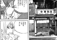 長々と続けてしまった水木マンガからの酒場などの引用記事でありますが、残すはあと2回分というところまで辿り着けました。まだまだ多くのマンガ家が待機しているから、次のマンガ家さんからは引用するコマももっと厳選すべきかと思わぬでもないのですが、パラパラめくってみるとどれも愛おしくて選別などできぬということになることを覚悟しているのでした。まあ長く続けるのは構わぬとして何が困るかというとさすがに書くことがなくなってしまうことであります。引用した絵だけをペタペタと張り付けるのが楽チンではありますが、それはどうも気乗りがしません。ということで今回は人気スポットである「水木しげるロード」、「水木しげる記念館」ではなく、その立地する鳥取県境港市について何か書きたいと思ったのでした。しかしいざとなると境港って随分昔に一度行ったきりだからこれといった書きたいネタなど思いつかぬのでした。困った時のGoogle Mapということで境港を見てみると、その地形がとても面白いのですね。境港市と松江市でほとんど取り囲むようにして中海があり、眼鏡状になってもうひとつが宍道湖がありその向こう側が出雲市になっているのです。恥ずかしながら鳥取県の地図をまじまじと眺めるのはこれが初めてらしくて、その日本海側の地形の独特な形状はとても印象に残ったのでした。昔、山陰本線を鈍行列車で座りっぱなしなのにひいこら言いながら乗り継いだことを思い出しますが、その際はこんなユニークな地図上を走っているとは気付かずにいたようです。『ゲゲゲの鬼太郎 2 妖怪軍団』(ちくま文庫, 1994)(「ぬらりひょん」,「悪魔ブエル」)『ゲゲゲの鬼太郎 5 妖怪大統領』(ちくま文庫, 1994)(「天狐」)『ゲゲゲの鬼太郎 6 妖怪反物』(ちくま文庫, 1994)(「かまぼこ」,「朧車」)『ゲゲゲの鬼太郎 第15巻』(講談社コミックス)(「鬼太郎夜話」)『ねずみ男の冒険 妖怪ワンダーランド1』(ちくま文庫, 1995)(「ああ無情」,「不老不死の術」)『怪奇館へようこそ 妖怪ワンダーランド4』(ちくま文庫, 1995)(「すりかえられた肉体」,「たたり」)『奇人怪人大図鑑 妖怪ワンダーランド8』(ちくま文庫, 1995)(「なめちゃん」)『京極夏彦が選ぶ!水木しげるの奇妙な劇画集』(ちくま文庫, 2001)(「鬼婆」)『幻想世界への旅 妖怪ワンダーランド3』(ちくま文庫, 1995)(「原始さん」)『死神の招待状 妖怪ワンダーランド6』(ちくま文庫, 1995)(「死神の招き」)『水木しげる特選怪異譚1 フーシギくん/おばけのムーラちゃん』(文藝春秋社, 2000)『糞神島』(双葉社, 1973)(「当世ますらお団 野坂昭如「当世ますらお団」より」) 今回は、ぼくが大好きなねずみ男がちょくちょく顔を出していますね。このキャラクターが精密に描かれた町や飲食店の前に佇む様子が実に可笑しいのであります。それに蕎麦屋でも中華料理屋でも寿司あでもなんでもいいけれど、どれも素晴らしいのです。こんな店だったら酒を出さぬはずはないだろうけれど、万が一にも酒を提供しない店だと知っていても入りたくなるだろうなあ。