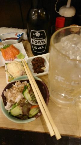まずは「ごっつり」という店名に聞き覚えがあったのです。これは随分前に北千住のお店にお邪魔していたのでした。もう5年以上昔の事らしくて店の雰囲気とかはすっかり忘れてしまっているけれど、店名にだけは覚えがありました。また、ここは以前は「駅前市場」というお店だったようです。見た目のムードというか装飾の方向性がほぼ同じようなものであったから、かつて訪れているものと思い込んでしまったんでしょうね。しかし「ごっつり 南千住店」は、未訪のお店だったのです。それは入ってすぐに判明したのです。まず席に着くやお通しを三択から選ばされるのでした。ぼくは明太子乗せ冷奴と悩んで冷しゃぶを注文。ついでに手頃なホッピーを頼みました。品書きを眺めてまたも未知のサービスに遭遇。100円のお刺身であります。この日はサーモンで一人前3切れと丁度良い量です。何人前にしますかと尋ねられたがぼくには3切れで十分です。そして11種から3種を選ぶ式のお手軽三種盛りは、ポテサラと何やら松前漬風の肴2種を頼むことにしました。ホヤの塩辛など呑兵衛好みのいいメニューです。もっとはっきりとした個性というと店名だけで分かる人には分かるのかもしれぬけれど、こちらは青森の山海の幸を提供する少しも田舎っぽくないご当地酒場なのですね。大体においてこうした酒場は結構なお値段を取ることが多いけれど、こちらは非常にお手頃で好感が持てますねえ。店の方に北千住にもありますよねと尋ねたら、ちょっと違ってますけどねと仰るので、ぼくは大いにこちらを気に入ったので、いやいや随分違いますよとお返ししました。