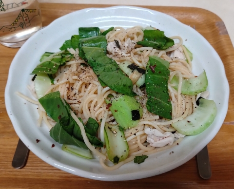 1. フライパンに鶏油を熱して鶏肉、小松菜、赤唐辛子を炒める。スパゲッティを加える。松茸の味お吸い物、水を加える。皿に盛って胡椒を散らす。