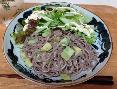 1. ボウルにそば、アボカド、めんつゆ、マヨネーズ、わさびを入れて混ぜる。皿に盛ってレタス、きゅうりを添えてマヨネーズをかける。