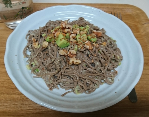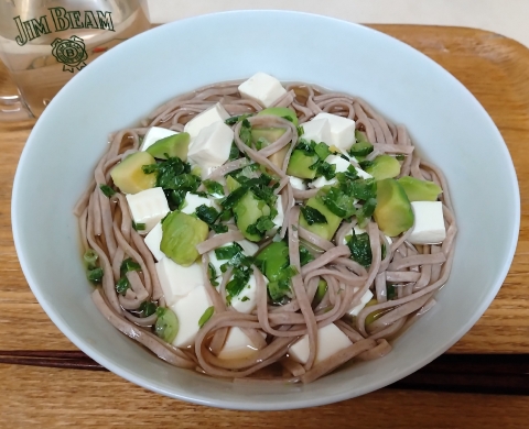何を思ったかアボカドと豆腐のそばを作りました。アボカドに豆腐を紛れ込ませることでヘルシーさを狙った次第です。