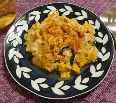 3. 耐熱皿に移して塩、胡椒した溶き卵を流し入れてオーブンで200℃15分焼く。