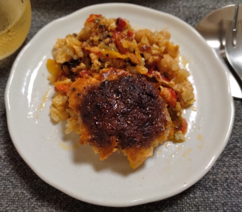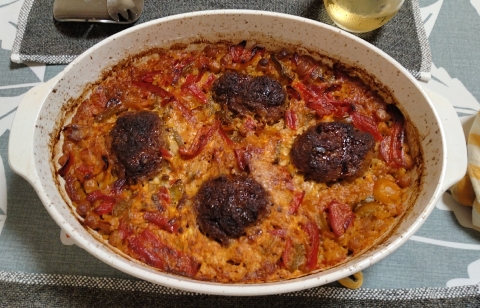 アロス・コン・コストラという料理がずっと気になっていました。食材も容易に手に入るものばかりだし、どうしてこれまで作らずにいたのだろうと我が事ながら怪訝に思ってしまうのですが、先日、近所のスーパーでひき肉をまるめただけのハンバーグ状に成形されたのが半額で売られていたので、これを使って試してみることにしました。