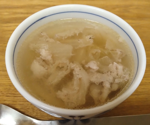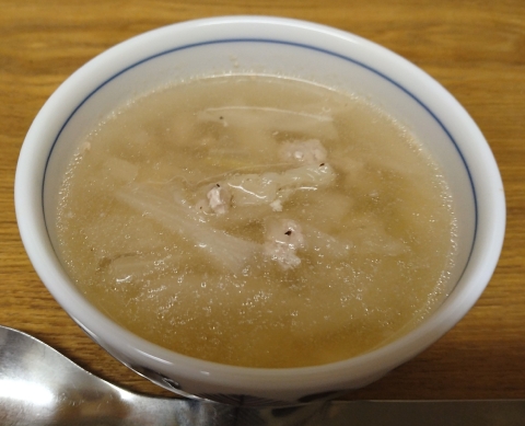 白菜と豚肉は好相性だから当然のことに白菜漬けも合うのが。ぼくは白菜漬けは古ければ古いほど美味しいと思うのですが、このスープを作ると酸っぱい漬け汁がとてもいい味であることがお分かりになると思います。って言われなくても分かり切ってるか。
