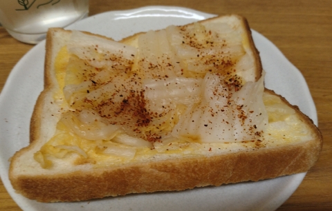 食パン(トースト/バターを塗る/白菜漬、チーズをのせる) 1枚/白菜漬・バター・チーズ(ピザ用)・胡椒