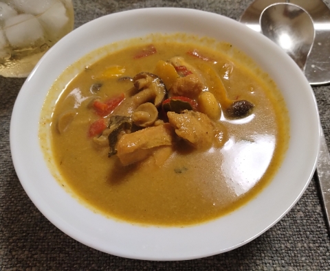 このレシピの生姜も本来はガーを用いるのが本場風なんでしょうかね。カレー粉ってのも、タイ式のカレー粉がありそうですし、レモングラスやパイマックルーも贅沢して冷凍物でいきたいところですが、そこは予算の関係で乾燥ものを用いるのです。まあ、それでもちゃんと美味しいのですね。本格的なのはタイ料理店で食べる事にしようと割り切ることにします。