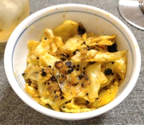 ココナッツオイル 大さじ1/にんにく 1/2片/カレーリーフ 1枝分/玉ねぎ(千切り) 1/4個/【A(混ぜる)】キャベツ(千切り) 1/4個/ココナッツファイン 25g/モルディブフィッシュ 10g/マスタード(H) 小さじ1/2/塩 小さじ1/2/青唐辛子(刻む) 1本/ターメリック 小さじ1/ココナッツミルク 大さじ2