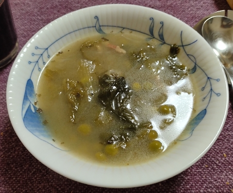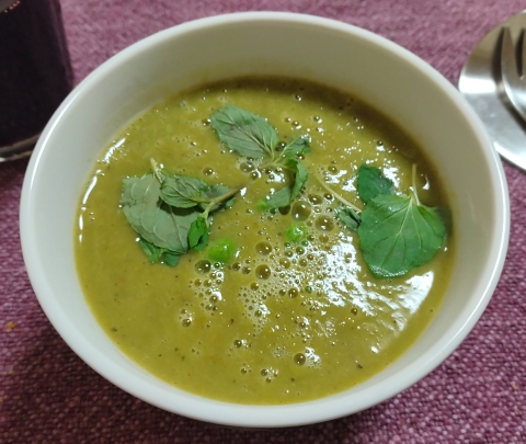 レタスとグリーンピースの組合せといえば、プチ・ポワ・フランセがあります。このレシピを初めて知った際には、これで本当に美味しいのかと懸念しつつ作って、食べてみたらなんとも旨くて衝撃を覚えたことを記憶しています。このイギリスで食べられているというスープはほとんど似たような材料を用いていてポタージュにしたものですが、なんとなんとこれまた大層旨いのでした。ミントを利かせているのがなんかオシャレでいいのですね。