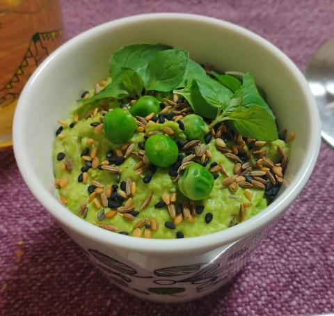 グリーンピース(冷凍/茹でる) 200g/ごま(白/練り) 大さじ2/油(オリーブ) 30ml/塩・胡椒 適宜/にんにく 小さじ1/レモン(汁) 30ml/【トッピング】グリーンピース(冷凍/茹でる)・ごま(白・黒/乾煎り)・クミン(H/乾煎り)・ミント 適宜