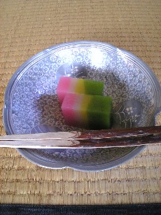 今朝、うぐいすの鳴き声で目を覚ましましたヌフヌフです。今年の冬は寒かったから、日増しに暖かくなるにつれ、春の訪れを実感します。さらに、今日のお茶のお稽古でこんな春らしい主菓子をいただきました♪両口屋是清の「早春の日」 なんとも春らしい・・・ピンクや黄色は菜の花や桃の花かしら?山々の雪が解けて木々の緑を表現した蓬の羊羹は春野菜の苦味を感じさせるさわやかなお味で、おいしかったです。春といえば、新しいことをはじめる時期ですよね。今日のお稽古は今までの「初級」のお点前より1ランクあがって「中級」のお点前を行いました。二つの違いは扱うお道具が異なること。今までの「初級」では「和物(日本の焼き物)」のお道具を扱うのですが、「中級」になると中国で焼かれた「唐物」や舶来物、由緒あるお道具の扱いを勉強します。今日は、唐物のお点前で使われるお道具をおさらいしたいと思います。まずは、お茶入れ。「文琳」という形で、林檎のようにぷくっと胴が張り出した形 ぷくっとした胴回りを小さくたたんだ帛紗で清めるのがムズカシイんです・・・蓋は今まで使っていた盛蓋(もりぶた)とちがって瓶子蓋(へいじぶた)です。お茶を入れる際に、盛蓋は伏せていたのですが、瓶子蓋はひっくり返します。水指は焼き物ではなく、木地物(白木のままで何も塗らない)を使います。 焼き物だと、胴模様が華やかだったりして、唐物が目立たなくなるからだとか。継ぎ目が正面になります。ただし、蓋は継ぎ目のない部分が正面になります。お茶杓は櫂先とは反対側の端に節のある「元節」と呼ばれるものを使います。 今までは節が真ん中にある「中節」と呼ばれるものを使い、お茶勺をお茶入れに預ける際に、今までは蓋の上に載せていたのですが、唐物のお茶入れの場合は、蓋に櫂先を掛けておくためかしら?そう覚えておけばグーね♪今までお道具の拝見などで唐物のお道具に触れることはあったのですが、初めて扱ってみてさらにお道具を扱う際の細心の注意を心得たいと思いました。由緒あるお道具には敬意を払ったりするんですよ。もっといろんなお道具を見たいなーって思っていたら・・・今月、大丸神戸店で「小堀遠州 美の出会い展」が!今月、大阪高島屋で「NHK 美の壷展」が開催されます!美に触れるいい機会!展示内容が楽しみです♪