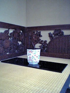 ヌフ・ヌフは毎週土曜日、お茶のお稽古をしています。今日は長板を使って一点飾りのお点前をしました。長板のお点前のときの留意点は・・・ お濃茶のときは、お席入りの前に濃茶入れを水指の前に お薄のときは、左手にお茶碗、右手に棗を持って水指の向かいに置き合わせます。 お道具(お濃茶の場合はお茶入れとお茶勺、お薄は棗とお茶勺)を清めて 水指の前に茶筅と置き合わせます。 です!上に飾っているのは、水指(みずさし)です。これがとてもステキなのです!!長板の黒色と赤絵の水指が素敵でしょ!先生に名前を聞いたところ「平安景雲のお作です」って。「平安」がつくと京焼きということがわかるんですって!フムフム…でも…照明があんまりやな…携帯を買い換えようと思いました。くっすん