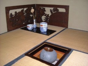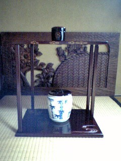 今日はお茶のお稽古。茶通箱(さつばこ)を用いて二種類のお濃茶を点てるお点前をしました。茶通箱という桐の箱に、仕服(しふく)に入れたお茶いれと、袋に入れた棗(なつめ)を背中合わせにしてそれぞれに異なったお濃茶を入れます。通常棗はお薄のときに用いられますが、写真のように袋や帛紗に入れると濃茶入れになります。ただしその時は無地の棗を用いるとのことです。このお手前どんな時にするかというと・・・、たとえばお茶事にいらしたお客からお茶を貰った時とかに、あらかじめ亭主が用意していたお茶と二種類のお濃茶を点てるときに行います。最初に点てるお濃茶は手前のお茶入れに、二種目のお濃茶は奥の棗に入れます。 お席入り前に、棚正面に茶通箱を持っていき、蓋を左に伏せ、お茶入れを右側に取り出します。そして奥の棗を扱って正面に向きなおし、茶通箱の中心にあらためておき、蓋をして棚の上におきます。このお点前の時の棚は右のような大き目の棚がよいとの事です。棚飾りの棗を右に寄せ、茶通箱を棚正面におきます。ふー。。。お道具が増えるとそれぞれの扱いがあるから、ちと大変お手前の中で、空で覚えておくと便利な語呂合わせ(?)が2つ1・「ありひら」 茶通箱の取り扱いで中にお道具が入っているときは左から手をかける。中にないときは右から。 なぜ左手からなのか→利き手じゃないほうの手を使うことで注意を促すとの事だそーです。2・茶巾・服紗で「今一種」 お正客が二種目のお茶を請うタイミング。ご亭主が茶巾を絞って、服紗を腰につけたら 「恐れ入ります。今、一種のお茶を頂戴いたします」と請います。あとー、棗を清めるときに帛紗をちり打ちします。「ぱん」という音が号令で、お正客はお茶碗をご亭主に返します。ほかに・・・なんだったっけ???でも、まぁーこうやって書き留めることで整理ができたワン
