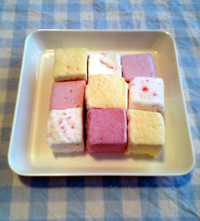 先日「リーがロイヤルホテル」の生マシュマロを食したヌフヌフです。はるぴん、とってもおいしかったよー黄色のマシュマロはパッションフルーツ味 薄紫のマシュマロはグレープ味白色にピンクのプツプツがあるマシュマロはドライストロベリーが入っています。濃い目の紅茶と一緒にいただくとなおいっそうおいしいよ♪ はるぴんへの報告でした。