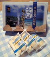 最近「雪塩ちんすこう」にはまっているヌフヌフです。「えーちんすこうの塩味?」って思われるかもしれませんが、コレおいしーんです!塩独特のザラツキ感や塩味独特の尖りがなく、そんでもって、ちんすこう独特のモッサリ感がなく…これって「雪塩」の仕業?…ということで、「雪塩」について調べてみました。「雪塩」の生まれ故郷・宮古島 宮古島は珊瑚礁でできた島となっており、島に降った雨水が珊瑚礁の石灰層を通って地下の海に流れ出ます。「雪塩」のもととなる海水は、石灰層を通ることでミネラル分を豊富に含んでおり、その海水で作られる「雪塩」はミネラル含有数が世界一であるとギネスブックに認定されたんだってー。通常の塩に比べミネラル分が豊富なことにより、塩独特のとがった後味がないのもコレが理由かな?また、独自の製造過程によって「雪塩」というその名のとおり、雪のようにさらさらパウダー状なんですって。だからかー「雪塩ちんすこう」を食べても後味にザラツキがないのは! 一度皆さんお試しあれ♪