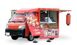 移動販売車で焼き鳥、牛串を販売する やきとり竜鳳 は煙を前方に出して香りを客側に振りまくことができるよう工夫した。