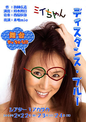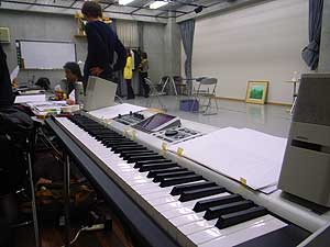今月の22日から24日まで、3日にわたってシアターVアカサカにて行われる、未唯さんのお芝居「ディスタンス ブルーの」リハーサルです。お芝居なので「舞台稽古」っていうんでしょうか・・で、俳優さんは未唯さんのみ、一人芝居です。音楽は僕の担当で、しかもリアルタイムでFantomやハーモニカを演奏します。こういったパフォーマンス、僕は初めての経験で、チャレンジングです!!!!音楽はあらかじめ作曲したものを、台詞に付けていくという感じ。もちろん台詞は、演技をするたびに多少伸び縮みがあって、僕の演奏もまた然りなので、それを見越して、アドリブ的なものを付け加えたりする要素も、楽曲に持たせてあります。また、俳優とミュージシャンが一緒にパフォームするからこそできるような部分もふんだんに取り入れています。未唯さんご自身は、既に1ヶ月以上前から稽古に入っていて、最初に音楽なしの未唯さんのお芝居を見せていただいたときは、めちゃめちゃ感動、感激でした!!!!!!!! はじめての体験ながら、インスピレーションが次々に湧いてきます。また、ミュージシャンとしての長~い階段を1段登れそうです。何はともあれ、このお芝居、笑えて泣けます。皆さん是非来てね!!!!!!!!!!!!!
