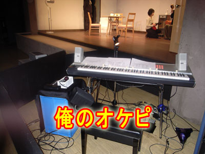 やってきました。「ディスタンス・ブルー」3日間で全4公演。オペラとか、ミュージカルでオーケストラとかバンドがいる場所を、オーケストラ・ピットって言います。通常ステージ手前の低い場所がそれですが、今回の僕の定位置は、ステージ手前の客席と同じ高さ!!!! つまり芝居中も全てのお客さんから僕の姿が見えてしまっています。お芝居と音楽の演奏がリアル・タイムで行われていることを、わかりやすく見せるための演出なのだそうです。僕の怪しい動きで、ミーさんのお芝居を邪魔したりしないか心配です。オーケストラ・ピット、略してオケピですね。----俺のオケピ----来てくれた皆様、ありがとうございました!!!!!!!!!!!