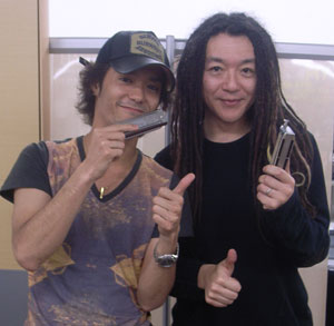 今日、8:15発の飛行機で沖縄から、よろめきながら帰ってきました。というのも、昨夜沖縄で、かなり多量の泡盛を飲んでしまったせいです。よろめくというよりは、常に前に向かって倒れながら、倒れまいと踏ん張る力が、結果的に前進するための原動力になって、帰ってきたという感じです。で、何の仕事で、沖縄に行っていたのかというと、ある方に、クロマティック・ハーモニカを教えに行っていたんです。こういった、個人的にハーモニカを教える、っていう仕事、僕はあまりやっていなくて、以前、いかりや長介氏がご存命のときに、氏が、死期間近いハーモニカを吹く老人の役として出演する、とある連ドラの撮影で、いかりやさんに「ハーモニカ指導」という形で、お付きして以来なんです。今回、僕が、ハーモニカを教えることになったのは、沖縄が生んだ超人気バンド「HY」のリーダーにしてリード・ヴォーカルのひとり、ヒデ君です。先日、同バンドのニュー・アルバムのレコーディングに、ハーモニカ奏者として参加したんですが、それを、どうしてもライヴで、自力で再現したい、とのことでした。そんなヒデ君の、ひたむきな情熱に打たれ、僕はこのお仕事をお受けしました。僕は、クロマティック・ハーモニカの半音レバーを、右手の親指で押します。もし、みなさんが初めて見たクロマティック・ハーモニカ奏者が僕だったら、見た目、何ら違和感はないと思うんですが、世界的に見てもこれはかなりの少数派で、かのスティーヴィーもトゥーツも、右手の人差し指で押すんです。なぜ? と訊かれれば、僕は「その方が見た目かっこいいと思うから・・」としか答えられません。だからヒデ君には、「自分のやりやすい指で押せばいいよ」とだけ言いました。でもヒデ君は、僕と同じ右手の親指でやりたいとのこと。同士がひとり増えました(笑)。今回は初レッスンということで、きれいな単音をどうやって出すか、といった、基本的なことがメインでした。あれだけ狭い範囲に穴が並んでますから、他の音が混ざらないように、綺麗にひとつの穴に息を作用させるって最初は難しいんです。で、その中にも、簡単だけどちょっとおいしいテクニック、なんかも伝授しました。心優しきバンド・リーダーにして、ソング・ライターでもあるヒデ君、さすがにいいスジ持ってるって感じ。これから何回かに分けて、HYのツアーに向けて、彼にレッスンします。