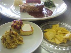 今日はお料理教室でした本日のメニューは・・・・・鶏肉のガランティーヌ&プラムソースモロヘイヤのグラタン(写真忘れた)トマトのマリネ モロヘイヤの炒め物 コリンキのサラダ オクラの花のおひたしと生ハム&チーズの巻物 糸瓜のサラダ かぼちゃプリン&チョコレートソース知らないお野菜やアレンジ法を知ることが出来たし自分ではやらないようなお料理が並んでお勉強になりました鶏肉のガランティーヌは持ち寄りパーティにも良さそう