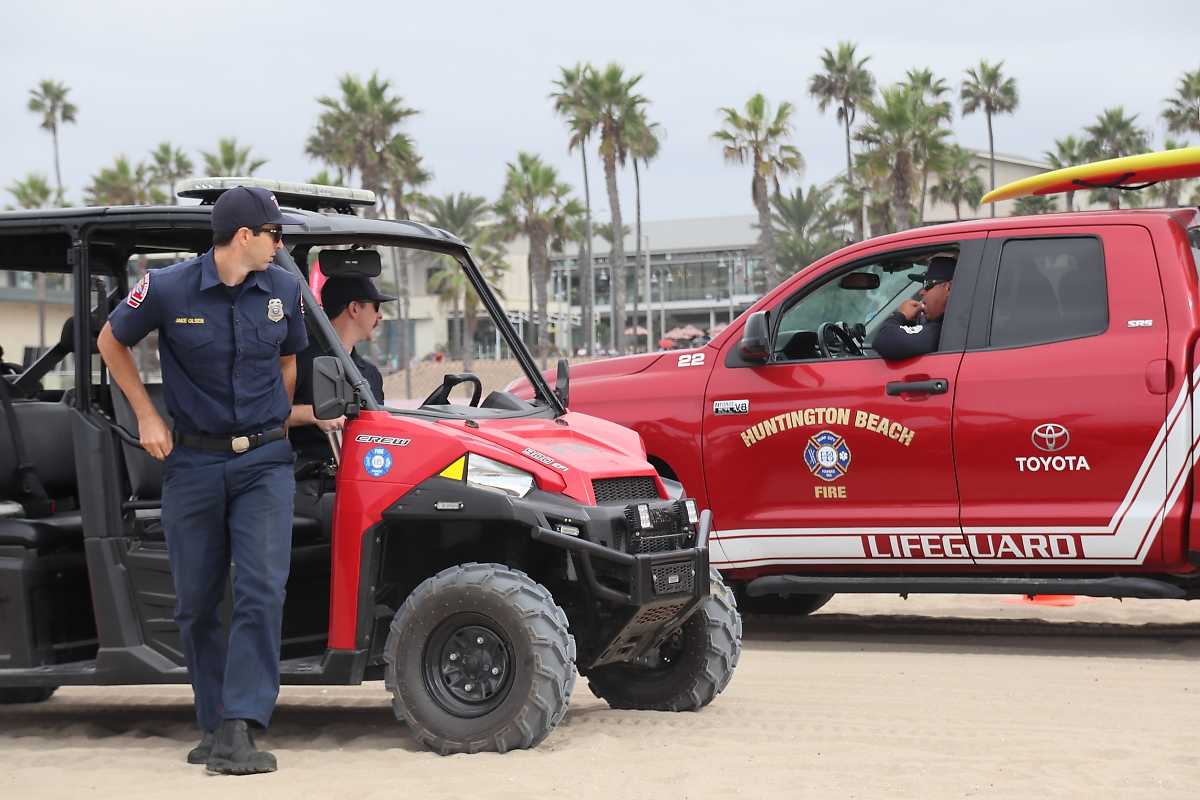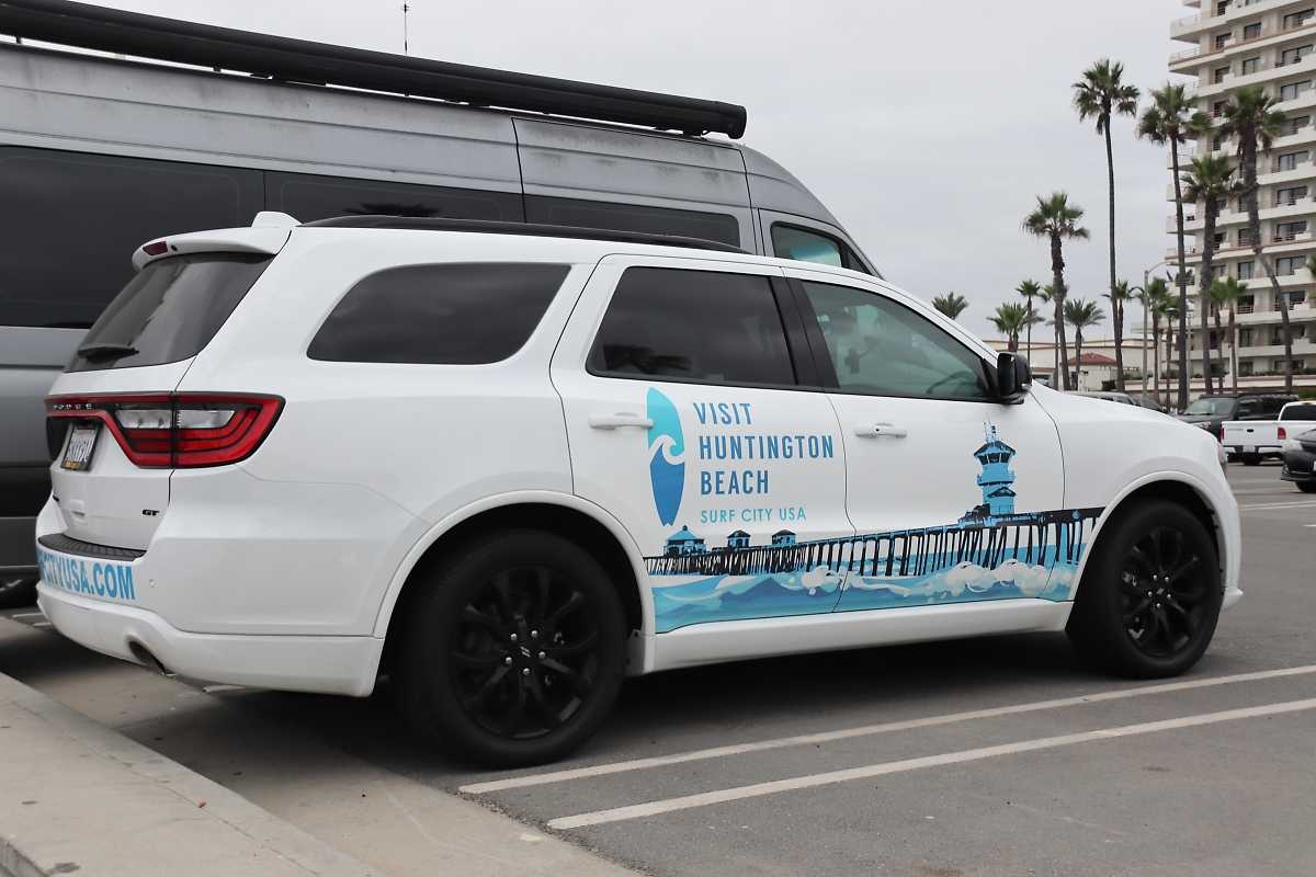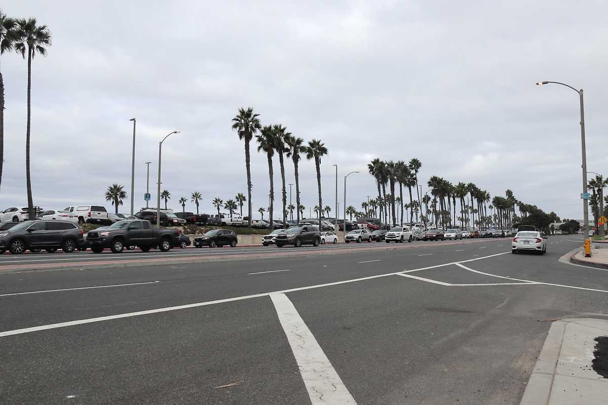 ビーチの駐車場へ入る車で大渋滞が発生していました。前方がロサンゼルスの方角で、後方がアナハイムの方角です。