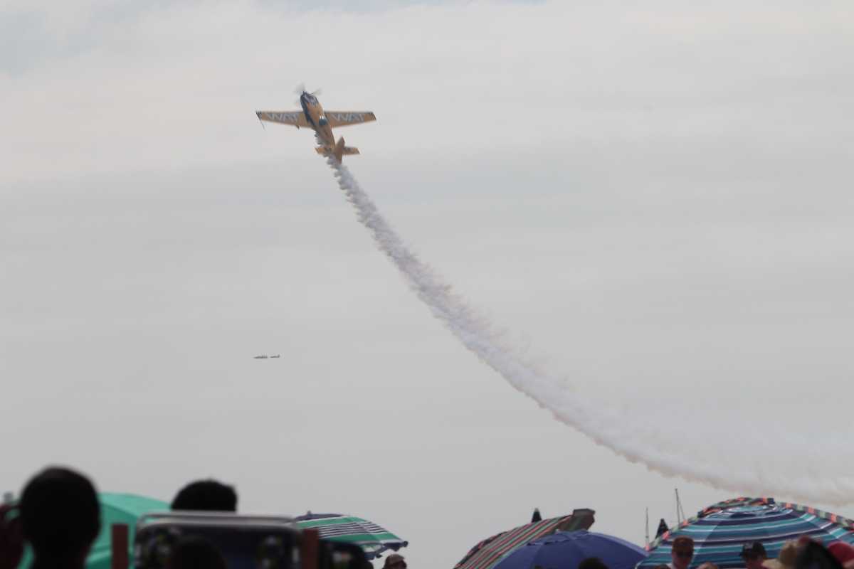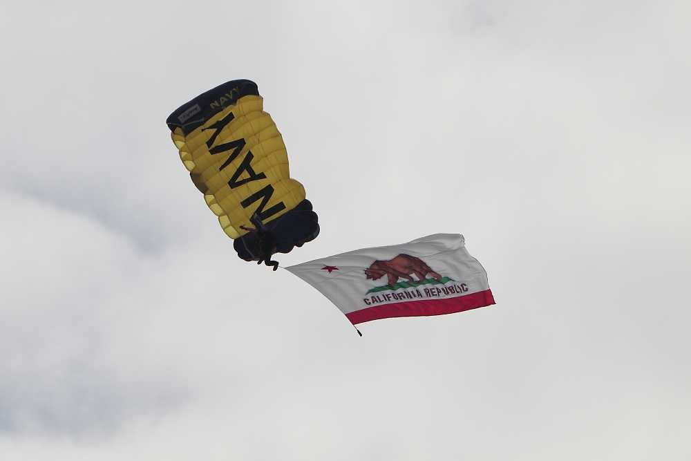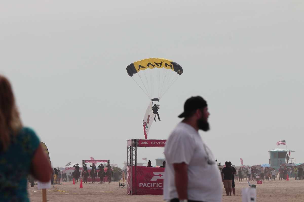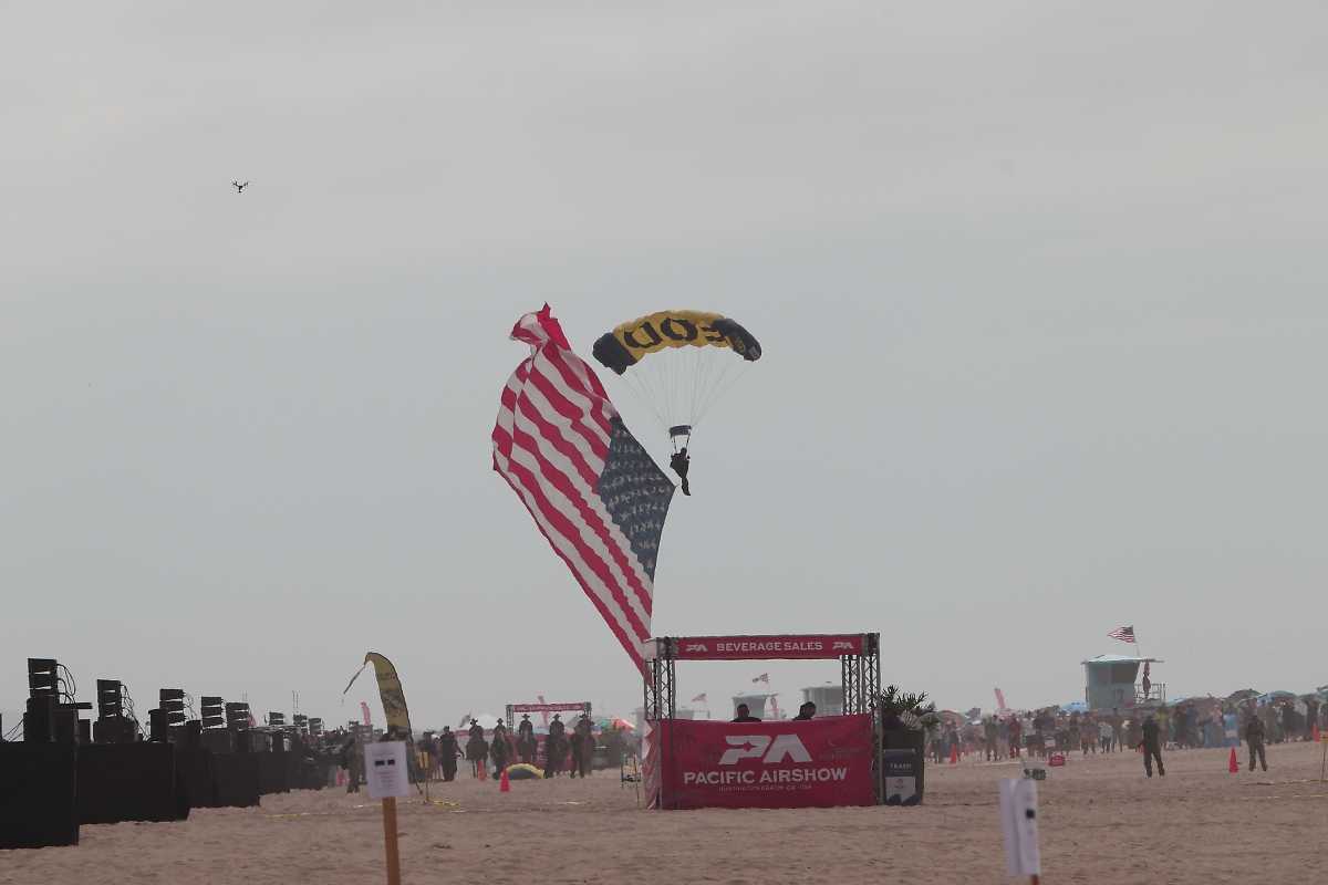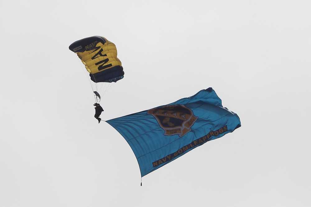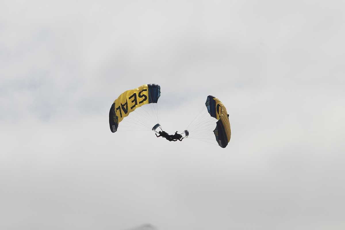 当日は晴れ予報だったのに、午前中のみ、あいにくの曇り空で少し残念でした。そこへ上空のオスプレイから降下してきた海軍特殊部隊シールズのスモークが紫色!?初めて見ました。