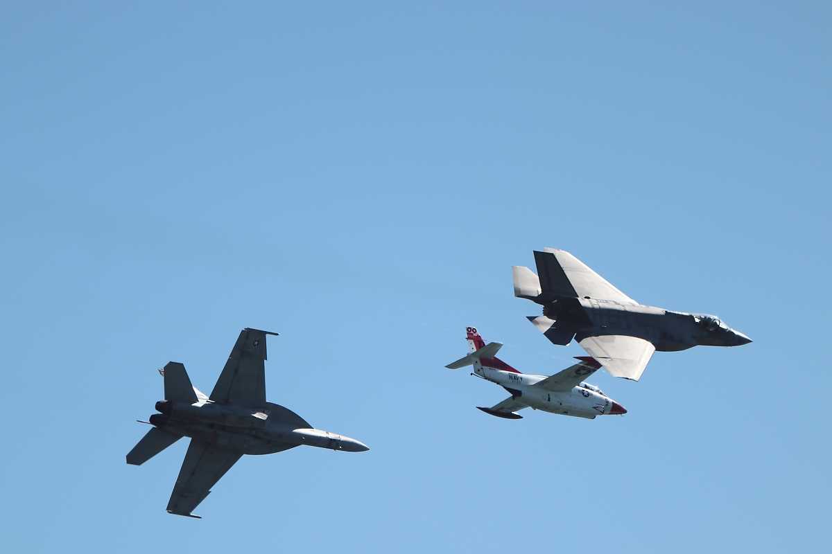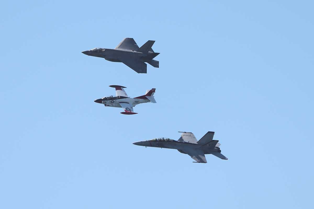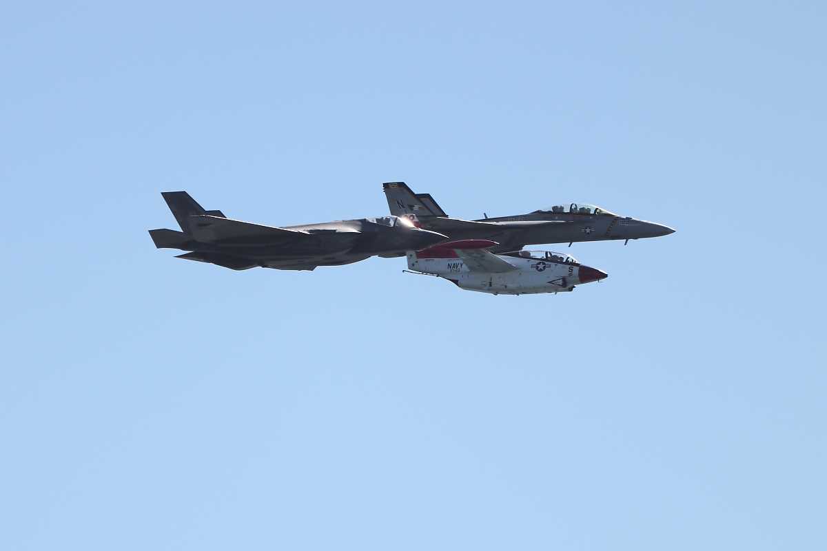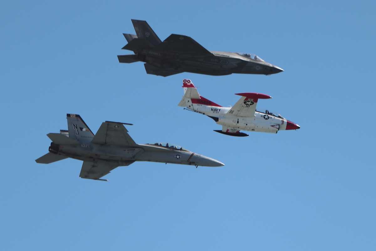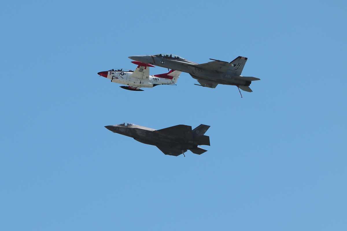 カリフォルニア州・レモア海軍航空隊基地所属、VFA-125 Rough RaidersのF-35C、ミシシッピ州・NASメリディアン所属、VT-23教育飛行隊のT-45 Goshawkが加わった豪華な編隊!