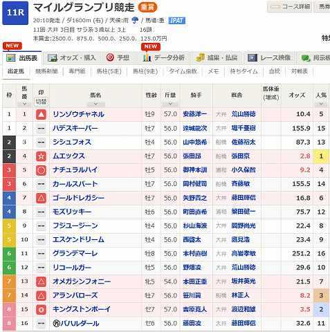 東京~武蔵野S予想です。昨年からダート王道GI路線でゴドルフィンマイル(GII)以外は大崩れしていない◎ペプチドナイルから。南部杯を叩かれGI勝ちの得意条件でここも上位争いしても。◎ 14 ペプチドナイル〇 16 ルクソールカフェ▲ 11 オメガギネス☆ 5 バトルクライヒモ△は1 ビダーヤ4 コスタノヴァ8 サンライズホーク買い目3連複 1頭軸14(1.4.5.8.11.16)23~8873倍3連複 2頭軸(11.16)1.5.8(5.16)1.4.8(5.11)1.4.847~7003倍ぽちっとよろしくねにほんブログ村競馬ランキング
