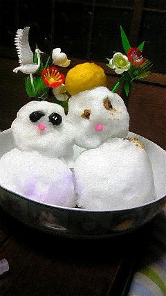 みなさん、あけましておめでとうございます今年も、のぶりんブログによろしくおつきあいくださいね。さて、年が明けて、はや2日。すでに、いろいろとありましたのでご報告。大晦日は、おじいちゃん家に集合して年越しそばとおせちをつまみながら、紅白と、ゆく年くる年をのんびりと見ておりました。ここまでは、いつもの変わらぬ年越し。その間に、外ではしんしんと雪が降り積もり・・・紅白の合間に、こんなものを作ってみました。のぶりんと姪っ子モモちゃんの合作です。紅白はまたまた白の勝利に終わり、2009年は雪とともに暮れていきました。明けて2010年。1月1日は、姪っ子モモちゃんの誕生日でもあります。ケーキでお祝い。その後、さっそく、「寒い!」といやがる女性軍をせきたてて、氏神さまに初詣。神社前の道路も凍結し始めていました。近所のお寺へとまわり、順序は逆ですが、除夜の鐘をつきました。元旦の朝は、やはり一面の雪景色。初日の出はあきらめてましたが、一瞬だけ、雪雲の合間からかすかですが、顔をのぞかせてくれました。元日は、1日中雪まじりの強風がふきつけてましたので、寝正月と決め込みました。ところが、この日の夕方から、また本格的に雪が降り始め・・みるみるうちに、昨日以上の勢いで積もっていきました。実は、大雪注意報が発令されると、宿直当番として出勤しなければなりません。心配は的中、9時すぎ、電話がかかってきて、大雪のため出勤せよとのご命令。しぶしぶ出勤すると、同じく貧乏くじをひいたお仲間がわたしを入れて4人。新年のあいさつをかわす気にもなれず、みんな渋い表情です。(融雪剤をまいたり除雪の作業は、原則、業者さんにお願いするので、我われが直接雪かきに借り出されることはほとんどありませんが・・まあ、情報収集や業者さんへの作業依頼、非常時のための待機・・というのが任務です)こうして、職場でほとんど眠れない一夜をすごし・・今日、2日の朝9時すぎ、ようやく解除。ところが、やれやれ帰れるぞ、とほっとしたのをあざ笑うように、「凍結した道路で車が横転し、ガソリンが漏れ出している」との急報が消防から入り・・・・(うちの職場は、道路を管理する部署なので、こういうときは現場へ行かねばなりません)現場での油の処理をすませ、寝不足と、思わぬ重労働で疲れ果てて家に帰ったのは、昼すぎ。(こーちゃんは遊びに、カミさんは郵便局のパートでご出勤なので家は無人です)仕方なく、さっきまで、おせちの残りをつまみながら、箱根駅伝を寂しく見ておりました。新年のごあいさつが遅くなってしまったのは、こんな事情です。とんだ、年明けになってしまいました。今年1年、波乱の予感が・・・・