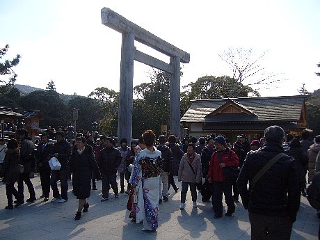 正月気分まださめやらぬ3連休の初日の土曜日、またまた初詣のはしごです。カミさん、おじいちゃんと3人で、真打ち? 伊勢神宮に行ってきました。(こーちゃんは、友達と約束があるとかで、合格祈願をしてくるようさい銭だけ預かりました)内宮近くにも駐車場があるんですが、渋滞を避け、パークアンドバスライド(年末年始の期間、郊外にある県営サンアリーナ駐車場から内宮行きのシャトルバスが出ています)を利用しました。バス優先のレーンを使うので、まったく渋滞につかまることなく、内宮宇治橋前まで行くことができました。パワースポットブームで、参拝者が増えているというお伊勢さん。写真ででも、伊勢詣気分を味わってください。 もちろん、こーちゃんから預かったおさい銭も投げ込み、志望校合格を祈願することも忘れませんでしたよ。 2年後の平成25年は、20年に一度、すべての社の場所を移してあたらしく建て替える神宮最大の行事「式年遷宮」です。伊勢神宮は、天照大御神を祭る内宮と豊受大御神を祭る外宮のほか別宮や摂社、末社も含め125の社の総称です。メインの参道から少し横道にそれたところにある別宮の「風日祈宮」にもお参りしました。もともと農作物の豊作をもたらす風雨をつかさどる神様ですが、鎌倉時代に元の大軍から日本を守った「神風」を吹かせた神様としても信仰されているそうです。お参りをすませ、門前町の「おはらい町」へ。三賀日ほどではないと思いますが、なかなかの混雑でした。時間は、ちょうどお昼。ランチは、名物伊勢うどんを賞味。 デザートは、ご存知、「赤福」の冬場限定のスイーツ「赤福ぜんざい」をいただきました。おいしゅうございました。 宇治橋前から再びシャトルバスに乗って、サンアリーナ駐車場まで15~20分ほど。本当は、内宮から数キロはなれたところにある外宮も詣でるのが本式ですが、内宮だけお参りする人が多いようです。 私らも、外宮はご無礼して、早々に帰途につきました。