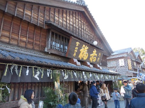 1月3日、昨夜来の雪が20センチほど降り積もった早朝、ちょっと迷いましたが、思い切って伊勢神宮に初詣に行くことにしました。わたしとカミさん、じいちゃんの3人で、7時過ぎ出発。息子はバイトで疲れているとかで留守番です。雪は鈴鹿くらいまでで、津から高速にのるころには、日陰にうっすら程度でした。神宮最寄りのICは交通規制で閉鎖されているので、そのまま直進して臨時ICで降りました。県営サンアリーナ周辺の駐車場に車を止め、シャトルバスで内宮へ。すっかり定着した「パーク&バスライド」です。バスは専用レーンを通るので、渋滞はありません。10数分で内宮近くのシャトルバス乗降専用駐車場に到着。まだ9時すぎです。(無理に神宮近くの駐車場まで行こうとするより、これを利用したほうが、ぜったい早いし楽だと思います。)内宮の参道おはらい町は、さすがに混雑していましたが、正月らしく華やいだ雰囲気に包まれていました。 遷宮で取り替えられた、まだ真新しい宇治橋の鳥居が朝日に照らされていましたが、橋を渡るのに行列したのは初めての経験かも。神域の参道を進むと、なにかしら厳粛な気分になってきます。やはりパワーというか、「気」のようなものに包まれているんでしょうか。遷宮から1年以上たちますが、まだまだ新築のように美しい本殿に参拝。(石段中央は30分の行列でしたが、今回は端っこから失礼しましたので、すぐ参拝を終えることができました。いつもなら、真正面からの参拝にこだわり、行列したところですが、今年は、無用なこだわりをすて、要領よく行こうと思っています・・・・そんなたいそうな決意でもないですけどね・・・)破魔矢(伊勢神宮では「福矢」と言います)や干支の置守りを買い求めた後は、おはらい町に戻り昼食。おなじみ、すし久のてこね寿司。人気店ですが、すこし早昼でしたので、それほど待たされずに案内されました。デザートは、これも恒例の赤福ぜんざいを賞味。本店で食べようと思うと、かなりの行列覚悟ですが、シャトルバス駐車場近くの支店は比較的すいていて、楽に食べることができました。 再び、シャトルバスで車をとめた駐車場に戻り、昼過ぎには伊勢を後にしました。大渋滞、大混雑を覚悟していましたが、拍子抜けするほどスムーズにお伊勢さん初詣をすますことができました。正月3が日中に伊勢神宮に初詣するのは、過去、記憶がありません。4日ってのはありましたが。帰途、松阪ICで下車。わたしの両親の墓がある飯南へ、正月の墓参りに。その後は、高速道路のUターン大渋滞を避け一般道中心で、夕方たどりついた我が家近辺は、まだ、ほとんど雪国状態でした。