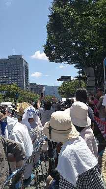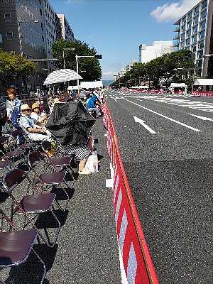 朝食は、昨日コンビニで買っておいたパンとコーヒーですませました。9時頃、旅館に荷物を預けてチェックアウト。快晴 猛暑の予感。昨日と同じルートで、市バス、地下鉄と乗り継いで、「市役所前」で下車しました。けっこう地下街が広がっていて、ギリギリまで炎天下を避ける見物客でごったがえしていました。地上に出ても、すでに場所を確保した人たちで黒山の人だかりです。わたしらは、山鉾巡行の有料観覧席を確保してあったので、ちょっと余裕です。(先月、有料観覧席のネット売り出し開始時刻前からパソコンの前で待機し、時報とともに頑張ってなんとか入手することができました。30分で完売・・・ ちなみに、最前列が5100円、2列目以降は4100円です。)6列に並べられたパイプ椅子の最後列。ぐずぐずしてると通行規制が始まるので、10時頃、早めに席に着きました。辻廻し(方向転換)が目の前で見れるベストポジションには、主に富裕層の外国人観光客向けの1席40万円の観覧席もありました。外国人が座りやすいように階段状の座席に畳や座布団が敷かれていて、パラソル、外国語イヤホンガイド付き。京料理やお酒を楽しみながら観覧できるそうです。誰が買うねん、って思いましたが、8割以上売れたとか。山鉾巡行の先頭、「長刀鉾」は9時、四条烏丸を出発、途中、長刀鉾に乗ったお稚児さんが道路の上に張られたしめ縄を刀で切り落とす有名な神事を経て、四条河原町の交差点を北へと方向転換する見所の「辻廻し」、河原町通を北上して、河原町御池交差点で再び「辻廻し」をして御池通を西進、わたしらが待つ付近へとやってきます。先頭がやってくるのがだいたい10時20分くらい。 わたしらの席は、矢印のあたりです。日陰がないので、とにかく暑いです。あとで知りましたが、この日の京都の最高気温は37度を超えたとか・・有料観覧席では、巡行中は日傘禁止です。帽子、濡れタオル、スポーツドリンク、塩分補給のタブレット錠、ハンディ扇風機、さらに霧吹きまで持参し、万全の態勢で臨んだんですが・・・・ようやく、先頭の「長刀鉾」が、河原町御池交差点での辻廻しを終えて、厳かにやってきました。 次から次へと、どんどんやってくると思ってましたが、途中で渋滞したり、辻廻しで手間取ったりしてなかなか来なかったりで、順調に巡行が進むというわけにはいきませんでした。その間、じりじりと照り付ける炎天下で、ひたすら耐える時間が続きました。有料観覧席の見物客はけっこう年配の人が多くて、自分たちも含めて、大丈夫かしら、と心配でした。遠くのほうで救急車のサイレンも聞こえました。10人近くの見物客が熱中症で救急搬送されたそうです。祗園祭の山鉾は全部で34基。うち、23基が前祭で巡行します。「山鉾」の「山」と「鉾」はどう違うか? ということなんですが、どうもはっきりしなくて、「鉾」はてっぺんに長刀や三日月、菊などの飾り物を掲げていて、「山」は葉がついた木を飾っている・・とか、「鉾」は「山」より歴史が古く、疫病や災難を祓い清める役目があるのに対し、「山」は後年、人形などを乗せた見せ物として曳かれるようになった、とか、諸説あります。以下、順不同で抜粋して紹介します。「○○鉾」とか「○○山」といった名前は省略しますね。あまり、よく覚えていないので・・・(笑)m(__)m ↑これだけは、印象的だったので名前を紹介。「カマキリ」の人形を屋根に乗せた「蟷螂山(とうろうやま)」です。21番目の「放下鉾」の辻廻しです。すでに時間は、先頭が行ってから2時間以上経過。午後1時に昼食を予約してあるんですが、その時間がせまってきました。あと、この鉾を含めて3基ですが、タイムアップ。後ろ髪を引かれる思いででその場を去りました。地下鉄市役所前から三条京阪、京阪電車に乗り換え、祇園四条で下車。昼食は、四条大橋近くの、「祇園ビストロ丸橋」。町屋風の洋食屋さんです。10分遅刻して入店。カウンター席でした。「季節のランチ」(鱧のカツレツと茄子の揚げびたし トマトのソースと梅肉のタルタル添え、サラダ、小鉢、スープ、ライス、デザート)をオーダー。料理も美味しかったけれど、脱水気味の体にビールがしみました。お腹を満たして、少し元気も出たところで、歩いて八坂神社に向かいました。千年の歴史を誇る祗園祭は、もともと京の都の疫病や災厄を祓う八坂神社のお祭りである「祗園御霊会」が発祥です。御朱印受付は2時半までで、少し過ぎてましたが、「時間切れやで」と言いたげな窓口のおばさんに頼み込んで書いていただきました。ちまきも購入。ちょっとうんちくですが、祗園祭において、山鉾巡行というのは神様が進む道筋を祓い清める行事で、もっと大切な神事が、山鉾巡行のあとに行われる「神幸祭」。八坂神社の3柱の神様を、四条通の新京極の近くにある「御旅所」という場所へ、このお神輿に乗せて運ぶ(渡御)神事です。昨日の宵山で四条通を歩いた際、たま