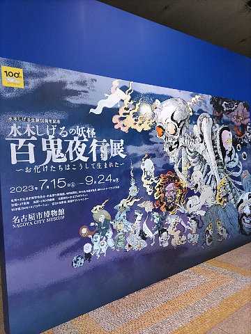 祗園祭から帰ってきた翌日は人間ドックでした。(しんどいなあって思いましたが、この日しか空いてなかったんです)検査後の医師の説明では、肝数値の悪化とか、潜血反応がなくても安心せず2年に1回は大腸カメラを受けたほうがいい、とか、脳のCTを見る限りまだ大丈夫だけど年齢とともに萎縮が進んでいくので気をつけるように、とか・・まあ、今回も面白くもないことをいろいろ言われました(泣)中でも、ショックだったのは、思ってもいなかった腎臓の数値。「eGFR」という腎臓の働きの度合いを示す数値が、昨年の検査よりかなり落ちている、ということで、正式ではないけれど、専門の腎臓内科での要精密検査確定ということでした。これ以上悪化が進むと、最悪、人工透析ってことにもなりかねない、なんて脅されました。ひえ~~正式な検査表が届いたら、さっそく行くつもりです。原因は何だろう??って考えると、思い当たるのは、前日、前々日の京都旅行。たぶん、軽い熱中症だったと思うんですが、多量の発汗による脱水症状で、旅行中、尿意はあるのにおしっこがあまり出ない、ってことが何度かあったんです。ネットで調べると、脱水症状になると、腎臓に送られる血流が少なくなって機能が落ちることがあるんだそうで、たぶん、これじゃないのかなあって思ってます。素人判断はだめだけれど。ちょっと暗めの話から始まりましたが、本題に入ります。20日の木曜日、1人で名古屋に行きました。世間では学校の終業式、夏休みの始まりです。名古屋駅でも大きなスーツケースを引っ張った親子連れを多く見かけました。さて、自分の目的は、名古屋市博物館で開催している「水木しげる生誕百周年記念 妖怪百鬼夜行展」地下鉄桜通線で桜山下車。歩いて数分です。妖怪漫画の巨匠 水木しげるさんは、惜しくも2015年に世を去りましたが、その功績をたたえ、水木さんの生涯と、妖怪たちとの出会い、そして妖怪漫画家、妖怪研究者としての足跡を、水木さんが描いた妖怪画や資料、映像などでたどる展覧会です。平日なので、それほど混雑はしていませんが、けっこう年配の方々が熱心に見学していました。撮影可の「ぬりかべ」の特大フィギュアです。ゲゲゲの鬼太郎でもおなじみですね。よく見てると小さな可愛い目が時々キョロキョロ動いてました。民俗学の大家 柳田國男の著作にも登場する、福岡県などで伝承される妖怪。夜道を歩いていると急に先が壁になり、前へ進めなくなります。水木さん自身も戦争中送られた南方戦線のジャングルで同じような体験をしたとのことです。「べとべとさん」奈良県など西日本各地で伝えられる妖怪で、通行人の後ろで足音を立ててついてくるんだそうです。そんな時は、振り返らずに、「べとべとさん、先におこし」と唱えると通り過ぎていくんだとか。水木さんが鳥取県境港で暮らしていた幼少期、近所に住む「のんのんばあ」と呼ばれていた老婆に聞かされた妖怪や死後の世界の話の中にも出てきたそうです。のんのんばあから聞いた不思議な話の数々が、その後の水木さんの妖怪への関わりの原点になったそうです。ドラマになった「のんのんばあとオレ」や「ゲゲゲの女房」でも、べとべとさんの話は登場してました。他にも、砂かけ婆、子なき爺、一反木綿、ぬらりひょん、小豆洗い等、お馴染みの妖怪たちの絵や伝承の説明書きもいっぱい展示してありました。(ただし、水木作品のオリジナルキャラである「鬼太郎」や「ねずみ男」、「悪魔くん」などは今回の展示ではほとんど取り上げられていませんでした。)2時間ほど、水木ワールドを堪能し、名古屋駅に戻りました。ちょうどお昼過ぎだったので、駅近くのビルの地下にあるビアホールで昼食兼昼飲み
